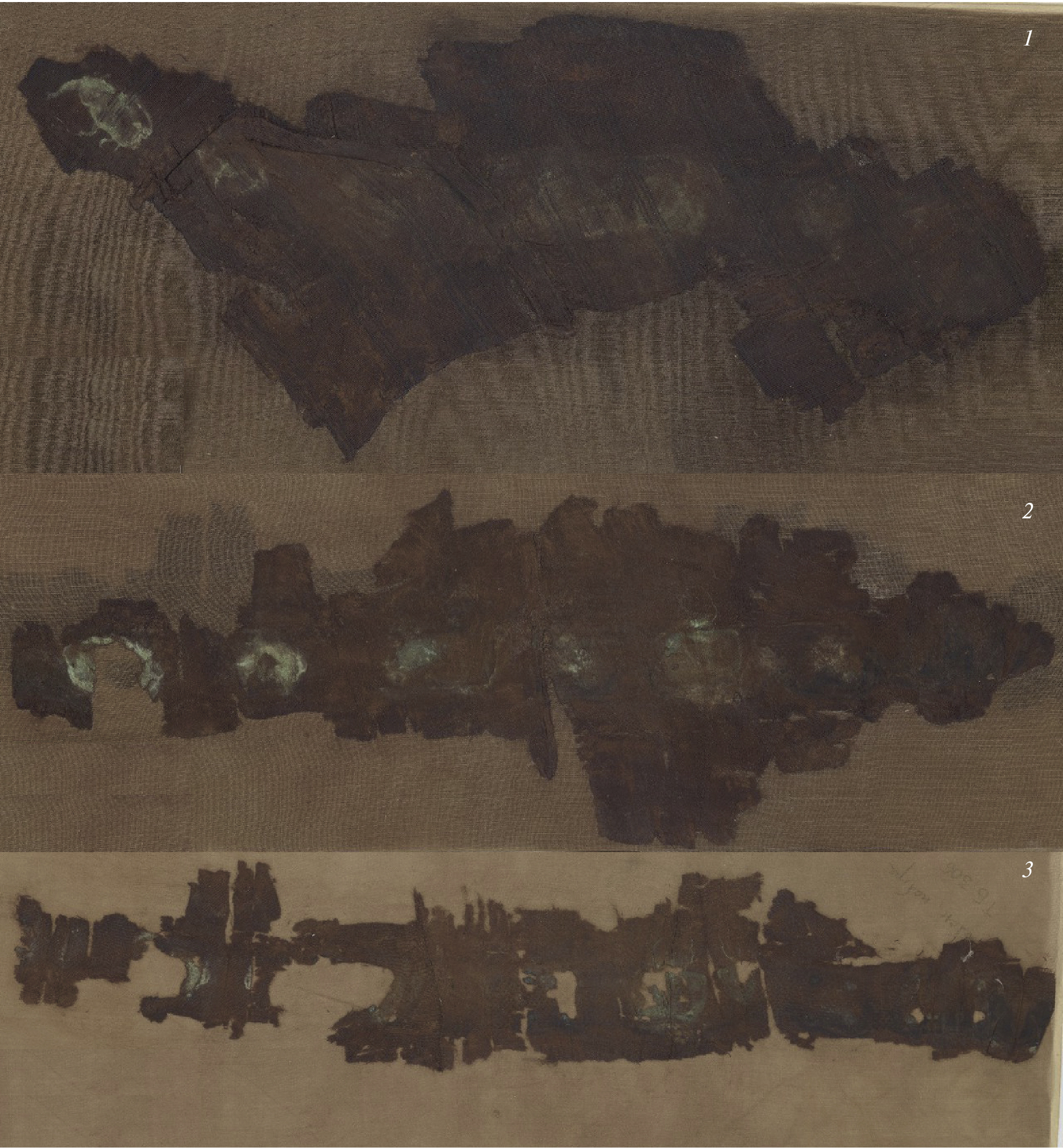 Fig. 2. Sash fragments: 1 – striped plain weave fabric; 2–3 – satin fabric without a pattern