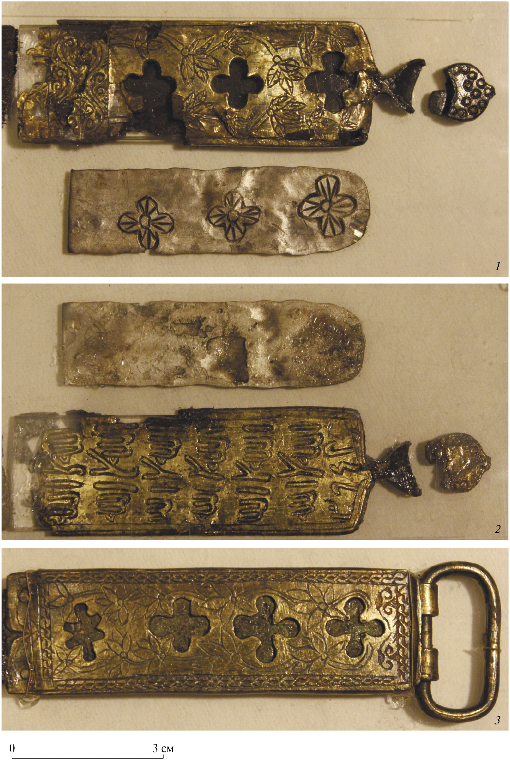 Пряжка (рис. 3, 3). Пряжка сохранилась лучше наконечника, однако, вероятно, рамка была переделана позднее. Лицевая пластинка имеет декор, аналогичный оформлению наконечника: три прорезных квадрифолия и четвертая прорезь у края с ремешком – шестилопастная. Декор дополнен гравированными цветочными побегами и пояском “меандра” по периметру пластины. Край у ремешка фигурный. Рамка пряжки простая, язычок утрачен. И наконечник, и пряжка имеют “готический” элемент – прорезные квадрифолии. Этот элемент не является исключительно западным мотивом: квадрифолиями украшен золотой наконечник, найденный в Булгарах (Крамаровский, 1985. С. 171. Табл. XII. 1,7), и бортики серебряного подноса, найденного около города Сургут в среднем течении р. Обь, выполненного, по всей вероятности, в Северной Сирии или Юго-Восточной Анатолии (Во дворцах и в шатрах, 2008. С. 40, 41. Кат. № 22).