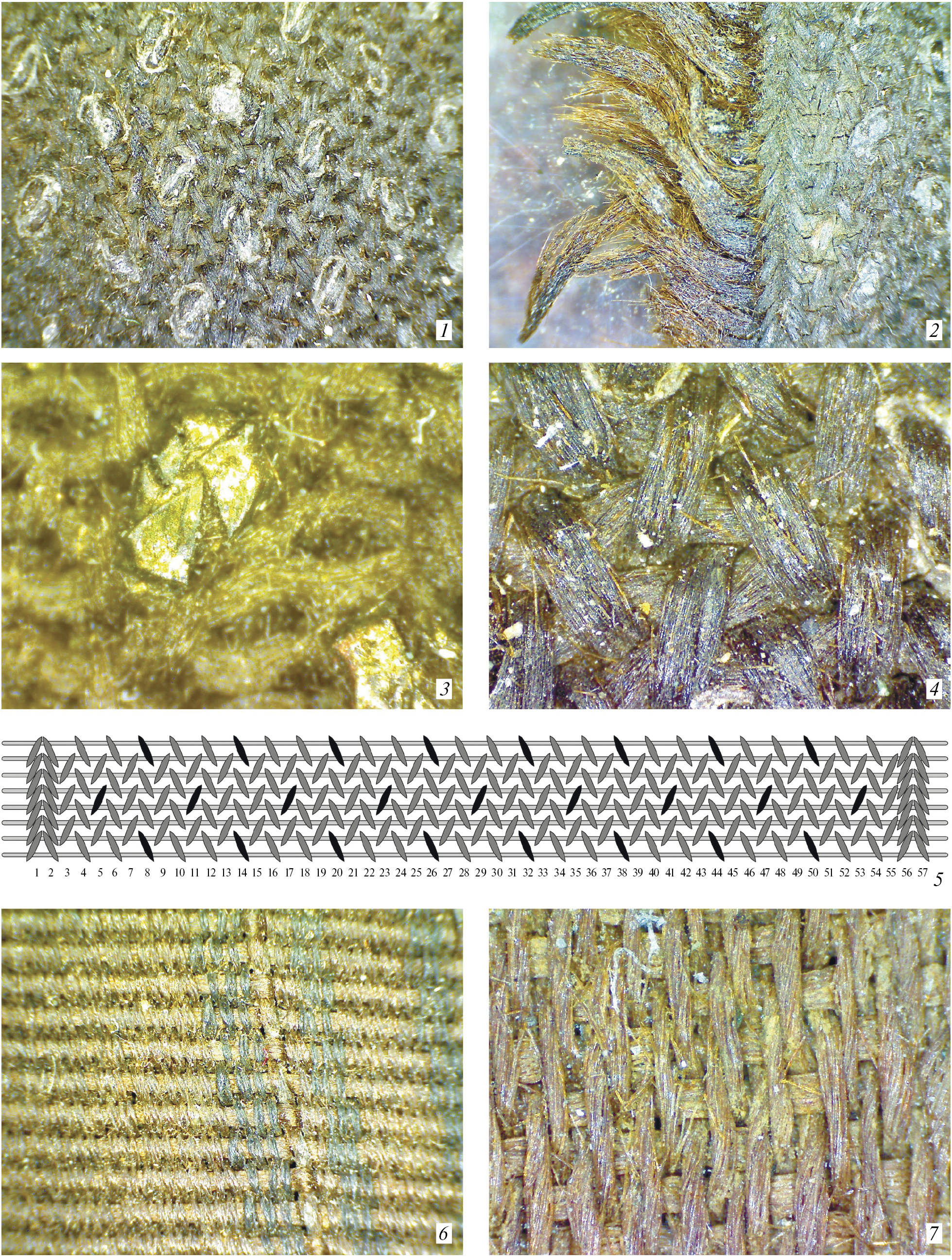 Fig. 4. Belt details: 1–4 – braid; 5 – braid weaving pattern; 6 – plain weave sash fabric; 7 – satin weave sash fabric