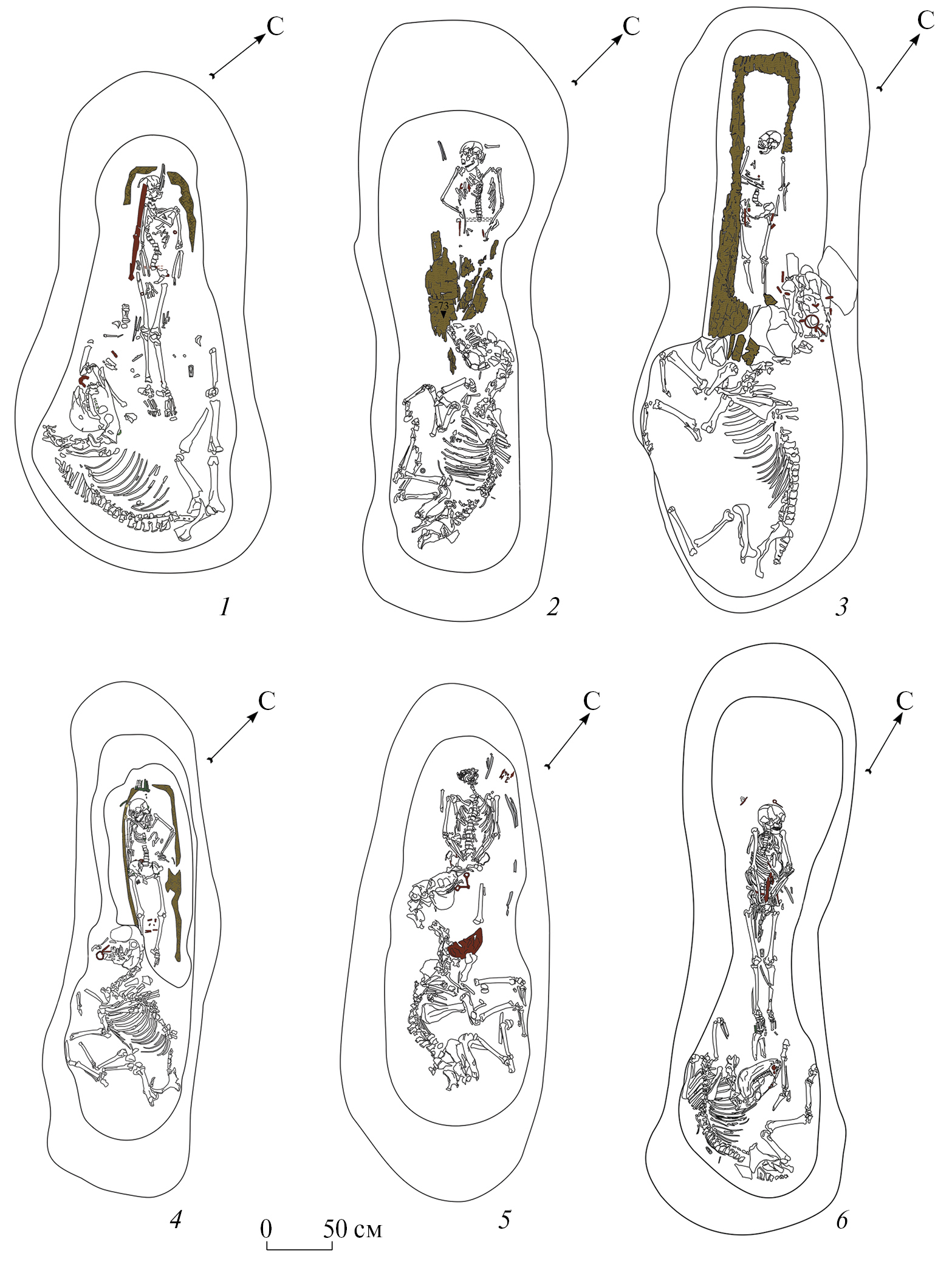 Наземные конструкции рассматриваемых объектов представляли собой плоские каменные наброски округлой или овальной формы (длина 3.2–6.2 м, ширина 2.2–5 м, высота 0.3–0.5 м) с крепидой по внешнему краю, вытянутой длинной осью по линии северо-запад – юго-восток. Под насыпями во всех случаях находилась одна могильная яма вытянуто-овальной формы, ориентированная продольной осью с северо-запада на юго-восток, с плотной каменно-земляной забутовкой. В десяти объектах находились “длинные” (3–4.8 м) могилы глубиной около 1 м от уровня древнего горизонта с деревянными конструкциями (колода, рама) и без таковых, содержавшие одиночные захоронения мужчин и женщин (рис. 3). Умершие были похоронены вытянуто на спине, головой ориентированы на северо-запад. Важным признаком являлось присутствие верховой лошади, уложенной в юго-восточной части могилы, “в ногах”, на одном уровне или поверх покойных (в последнем случае перекрывая до трети тела человека). Животные были обращены головой в одну сторону с погребенными людьми и размещались преимущественно на правом боку.