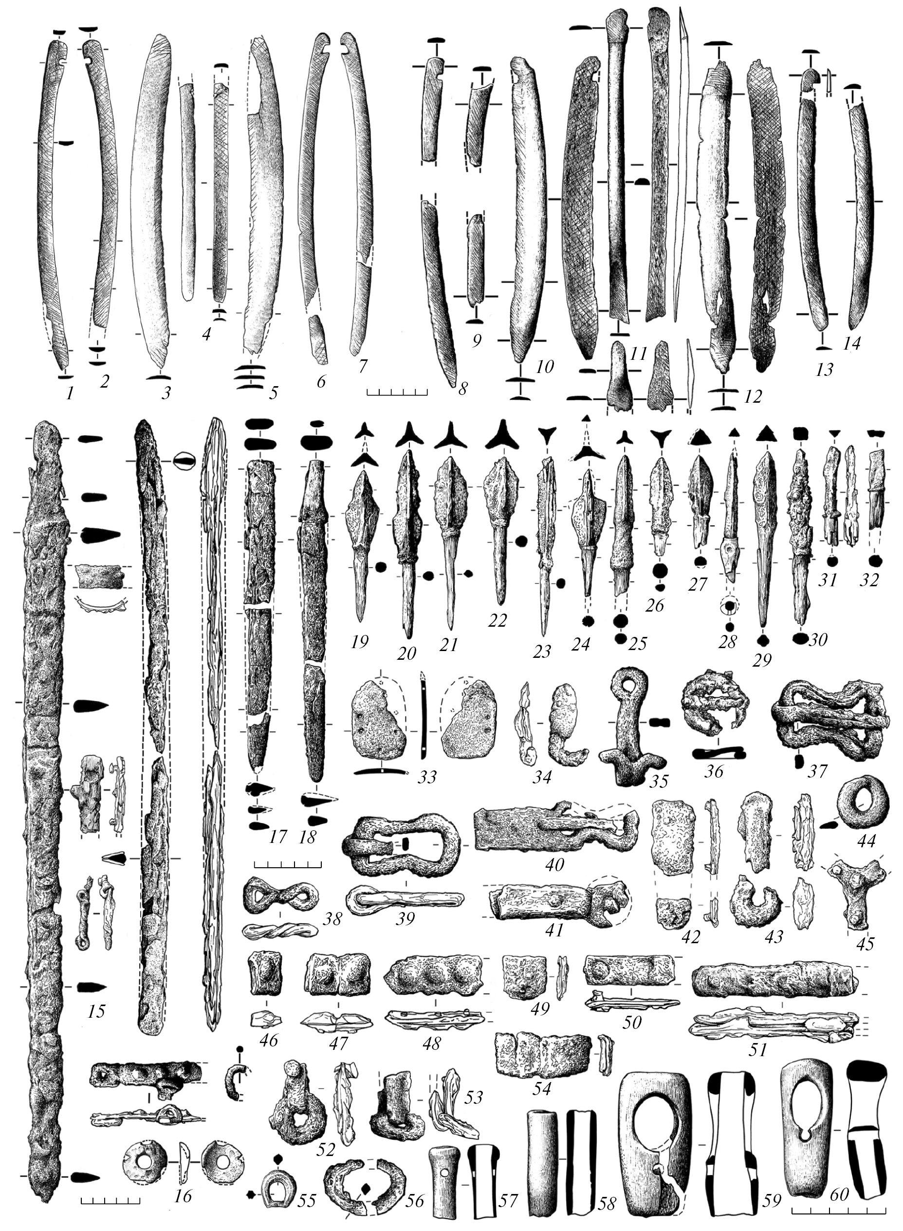 Рис. 4. Комплекс вооружения и снаряжения из могильника Чобурак-I: 1–14 – накладки на лук; 15, 16 – мечи с деталями ножен; 19–32 – наконечники стрел; 33 – панцирная пластина; 34, 35 – колчанные крюки; 36, 37, 39–41 – поясные пряжки; 39 – крепление; 42 – наконечник ремня; 43, 44, 56 – “блоки”; 45 – распределитель ремней; 46–53 – поясные бляхи; 57–60 – детали плетей (1–14, 57–60 – кость (рог); 16–56 – железо).