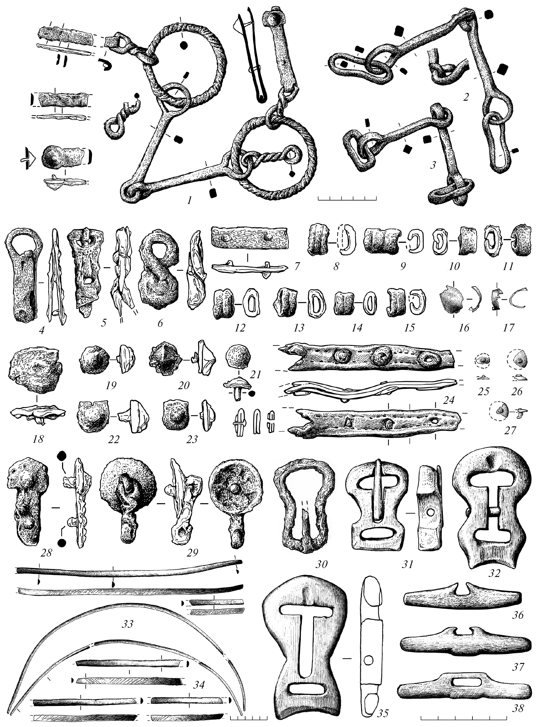 Рис. 5. Снаряжение верхового коня из могильника Чобурак-I: 1–3 – удила с деталями узды; 4, 5 – уздечные пряжки; 6 – уздечная застежка; 7–15, 18–23, 25–27 – уздечные бляхи; 16, 17 – детали нагривника; 24 – ремень суголовья; 28 – наконечник ремня; 30–32, 35 – подпружные пряжки; 33, 34 – седельные канты; 36–38 – цурки (1–15, 18–23, 28–30 – железо; 16, 17 – цветной металл; 24 – кожа, бронза; 31–38 – кость (рог)).