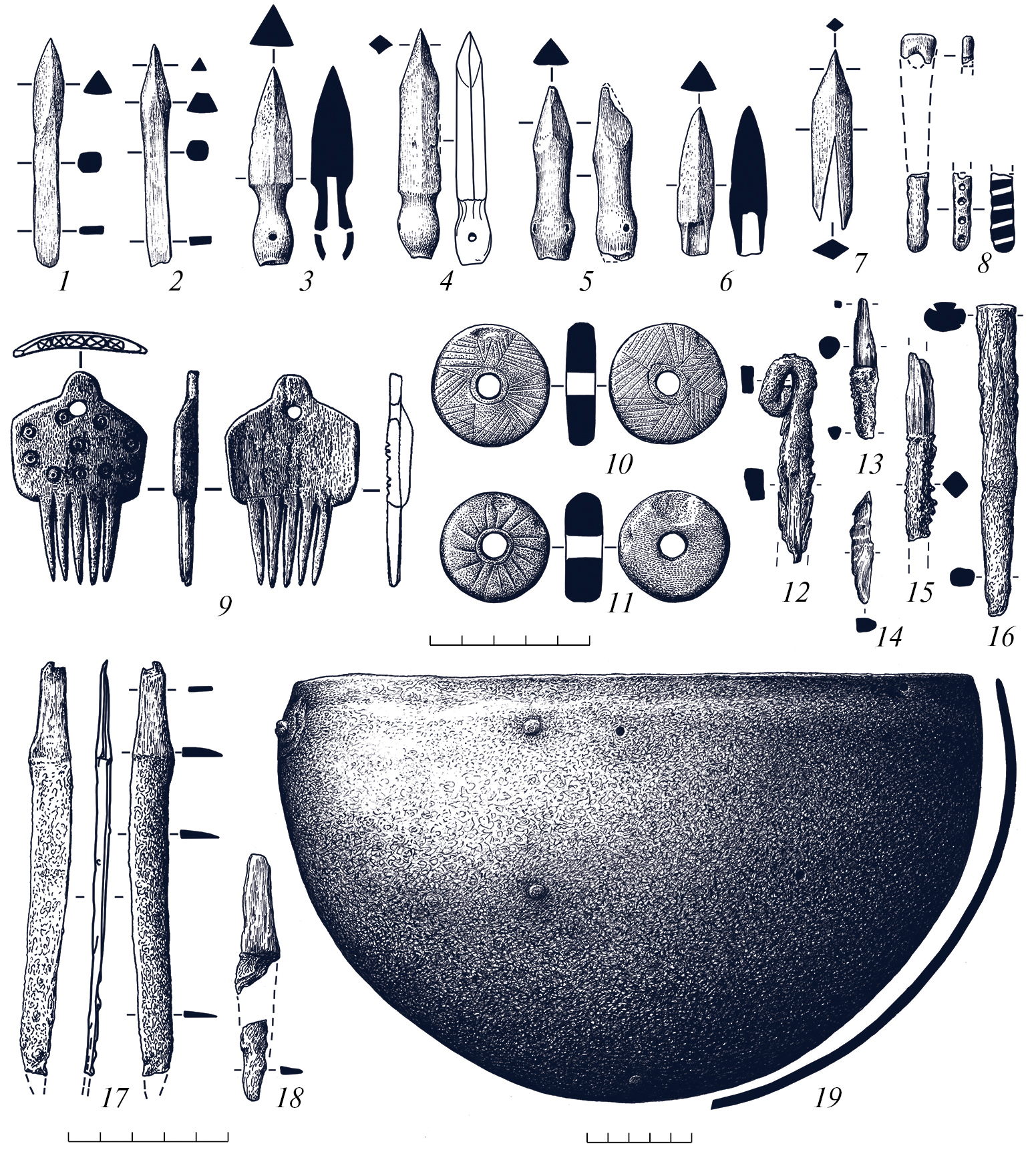 Рис. 6. Орудия труда и предметы быта из могильника Чобурак-I: 1–7 – наконечники стрел; 8 – рукоять косметической щетки; 9 – гребень; 10, 11 – пряслица; 12–15 – шилья; 16 – инструмент; 17, 18 – ножи; 19 – реконструкция котла (1–9 – кость (рог); 10, 11 – камень; 12–19 – железо).