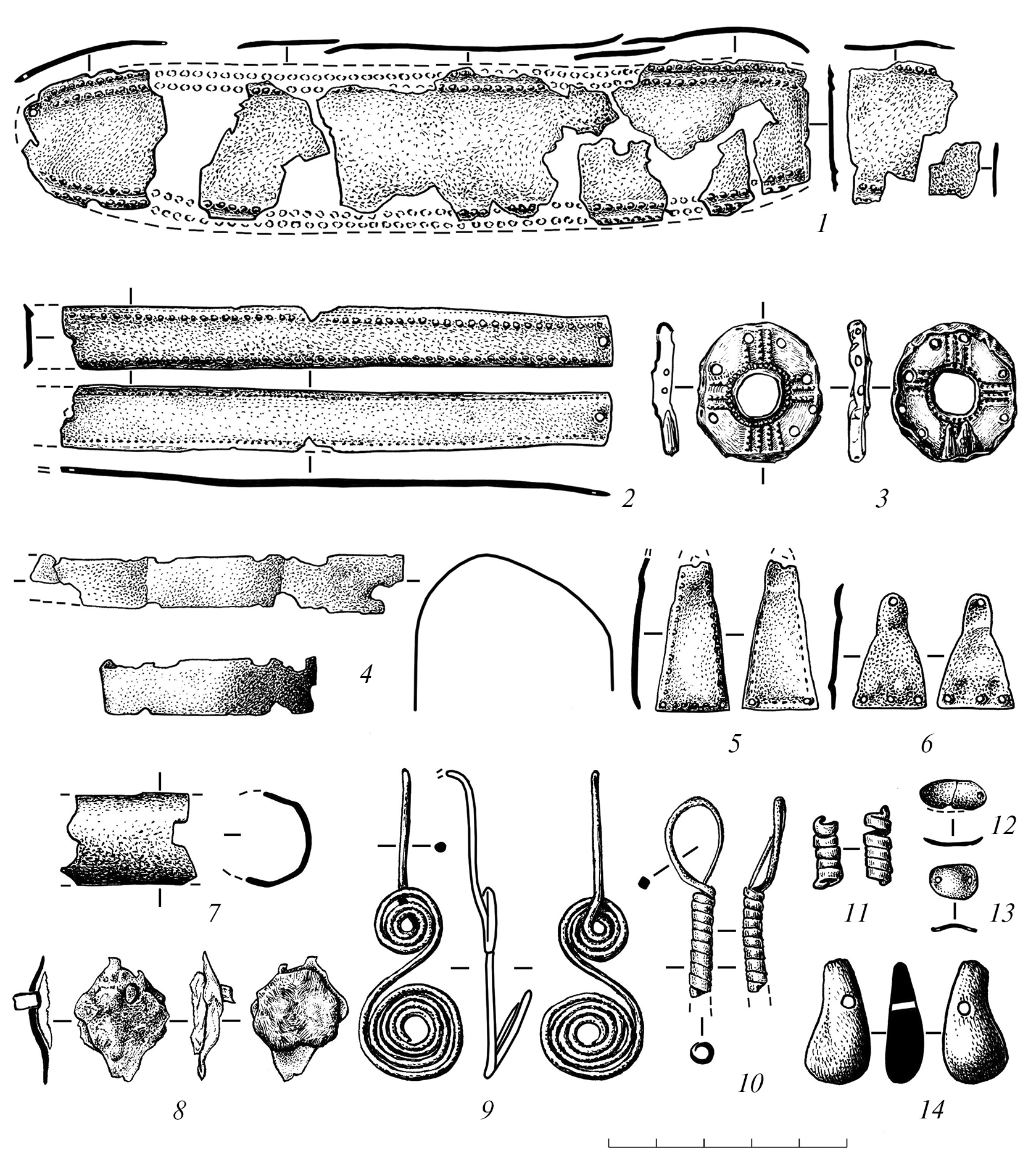 Рис. 7. Украшения из могильника Чобурак-I: 1, 2, 4 – нашивные пластины; 3, 5, 6, 12, 13 – бляхи; 7 – накосник; 8, 14 – подвески; 9, 10 – серьги (1–7, 9–13 – цветной металл; 8 – железо; 14 – кость).