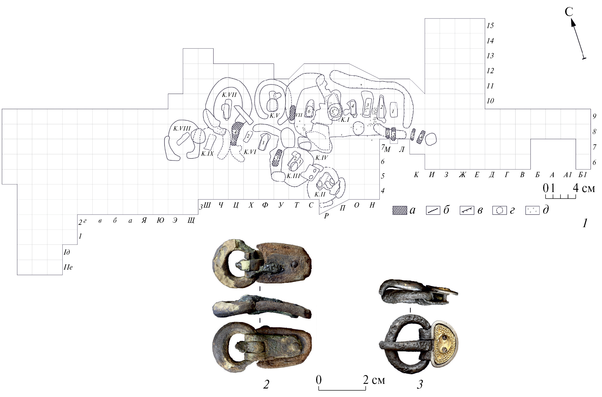 Рис. 2. Могильник Юванаяг. 1 – план раскопа могильника Юванаяг; 2 – обувная пряжка; 3 – поясная пряжка (обе находки – погр. 5, к. I). Условные обозначения: а – впускные и грунтовые погребения; б – курганные ямы-канавки; в – курганная насыпь; г – грабительские вкопы, ямы от деревьев; д – фрагменты кольчуги. Здесь и далее фотографии Е.В. Попова.