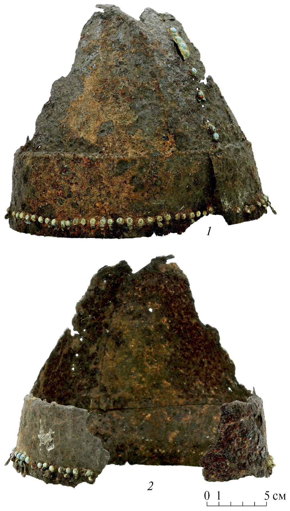 Рис. 3. Шлем могильника Юванаяг. 1 – вид сзади; 2 – вид спереди.