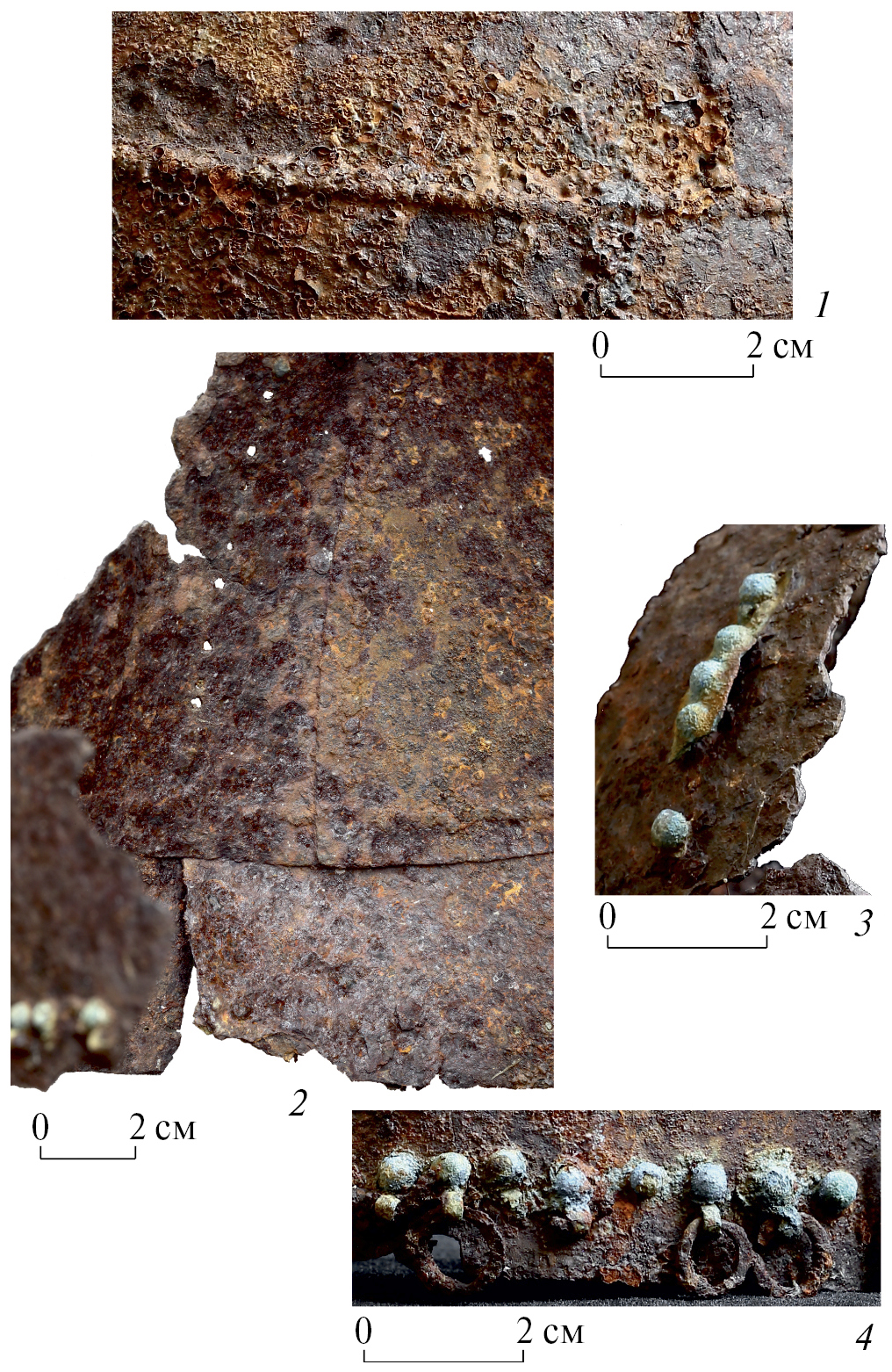 Шлем железный, вытянутый, уплощен с боков, купол собран из двух половин (рис. 3). Высота – 18 см, диаметр основания – 19. Изделие сильно разрушено, сохранились задняя часть левой половины купола и бо́льшая часть обода. Ширина обода – 6 см, концы соединены между собой сзади. Левый и правый сегменты купола не примыкают друг к другу, а удерживаются продольной полосой (рис. 4, 2). Ширина основания полосы, соединяющей половины купола, – 7.5 см, к верху она сужается. Способ крепления частей – клепка при помощи мелких железных штифтов, которые видны по верхнему краю обода и с внутренней стороны шлема (рис. 4, 1). В качестве декоративного элемента использованы полусферические бляшки-накладки диаметром 0.5 см (рис. 4, 3). Сзади и по бокам шею владельца защищала бармица, от которой остались отдельные кольца, их внешний диаметр – 1.1 см, внутренний – 0.6 (рис. 4, 4).