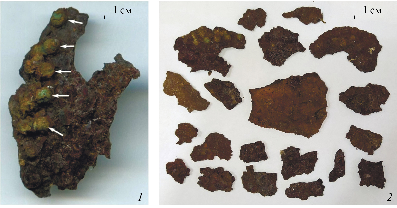 Рис. 5. Исследованные фрагменты шлема. 1 – латунные накладки (показаны стрелками); 2 – железные пластинки с основной части шлема.