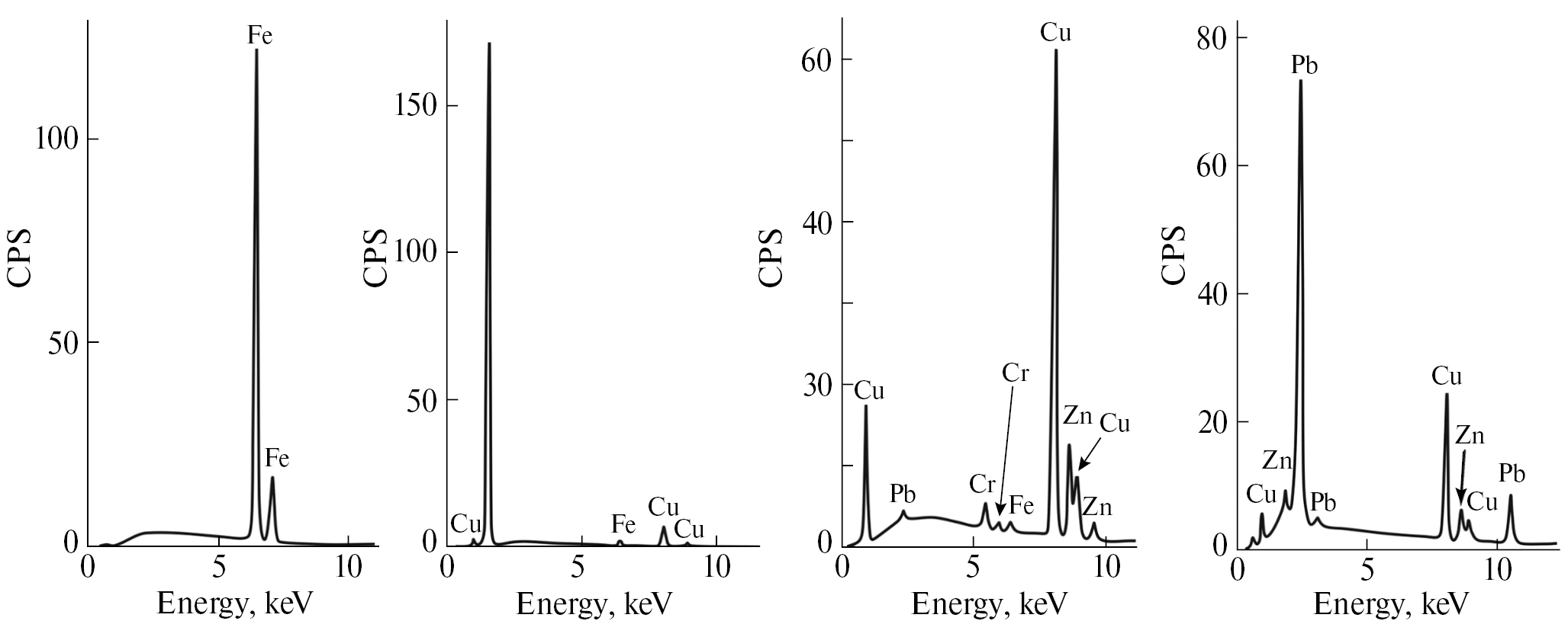 Fig. 6. Typical energy-dispersive spectra of the main metal phases in the helmet