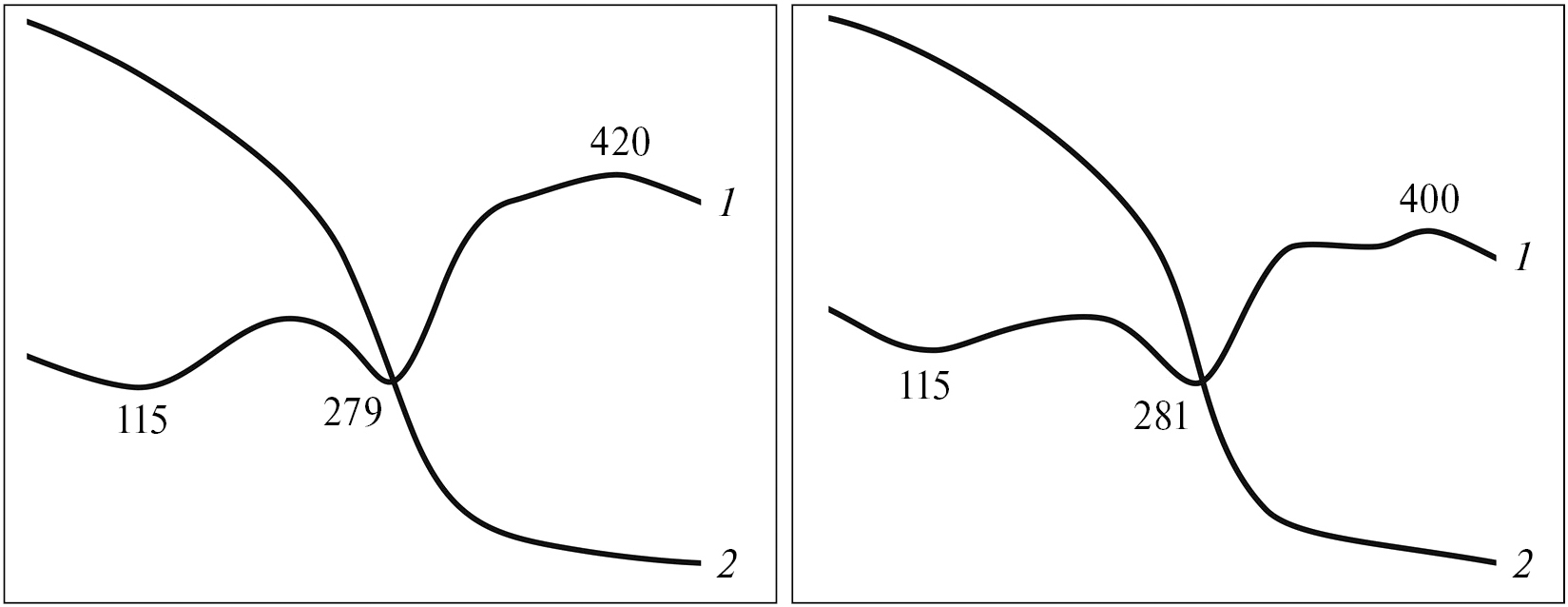 Рис. 7. Данные термического анализа железного материала воинского шлема. Кривые: 1 – нагревания, цифры на кривой – температуры эффектов, ˚С; 2 – потери веса.
