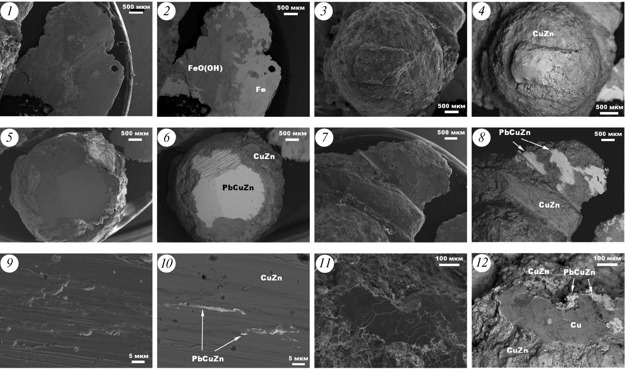Рис. 8. СЭМ-изображения металлических и оксигидроксидных фаз на воинском шлеме. Объекты: 1, 2 – железная часть шлема; 3–12 – накладки. Фазы: Fe – железо, FеO(OH) – оксигидроксиды железа, CuZn – латунь, Cu – медь, PbCuZn – свинцово-медно-цинковые сплавы. Изображения в режимах вторичных (1, 3, 5, 7, 9, 11) и упруго-отраженных электронов (2, 4, 6, 8, 10, 12).