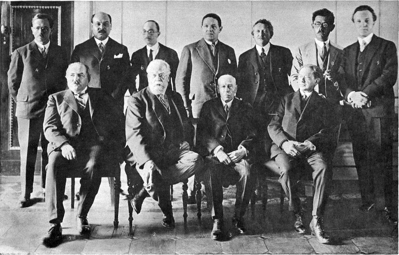 Fig. 3. Participants of the International archaeological congress (Berlin, 1929). Seated (left to right): Axel Persson (Uppsala), Henri Begouën (Toulouse), José Ramon Melida y Alinari (Madrid), unknown; standing (left to right): Andreas Alföldi (Debrecen), Emil Panaitescu (Bucharest), Giuseppe Lugli (Rome), unknown, Hugo Obermeier (Madrid), Eleazar Lipa Sukenik (Jerusalem), Boris Zhukov (Moscow). B.S. Zhukov’s daughter left the inscription on the photo: “Father. Far right at the celebration in Berlin Archaeological Institute”. Photo from the newspaper Zeitbilder 28 April 1929