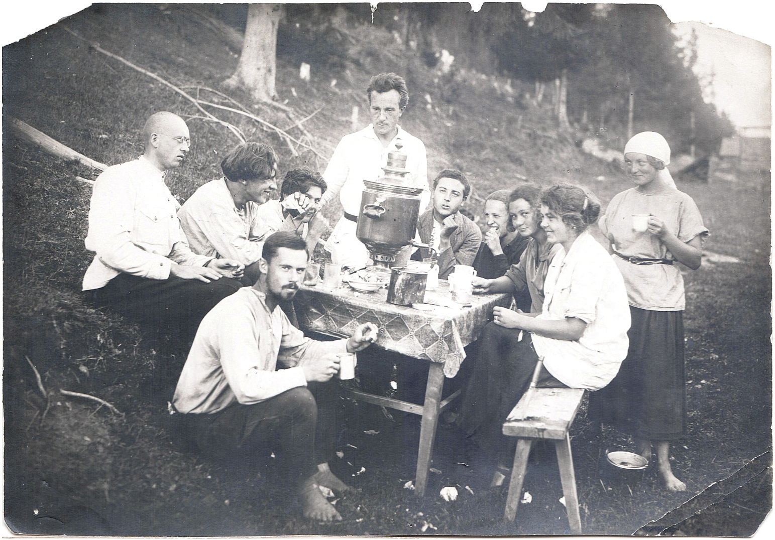 Fig. 5. In the expedition camp on the Kerzhinets River. Left to right, clockwise: O.N. Bader, P.I. Zenkevich, S.P. Tolstov, A.I. Goryunov, B.S. Zhukov, M.G. Levin, T.A. Trofimova, A.E. Alikhova, E.I. Goryunova, standing E.R. Lebedeva. Vetluga expedition, 1926