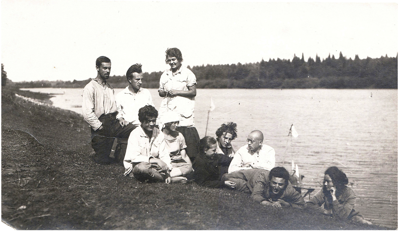 Рис. 6. На берегу Ветлуги. Слева направо – задний ряд: О.Н. Бадер, Б.С. Жуков, Е.И. Горюнова; передний ряд: А.И. Горюнов, Е.Р. Лебедева, Т.А. Трофимова, С.П. Толстов, П.И. Зенкевич, М.Г. Левин, А.Е. Алихова. Ветлужская экспедиция, 1926 г.