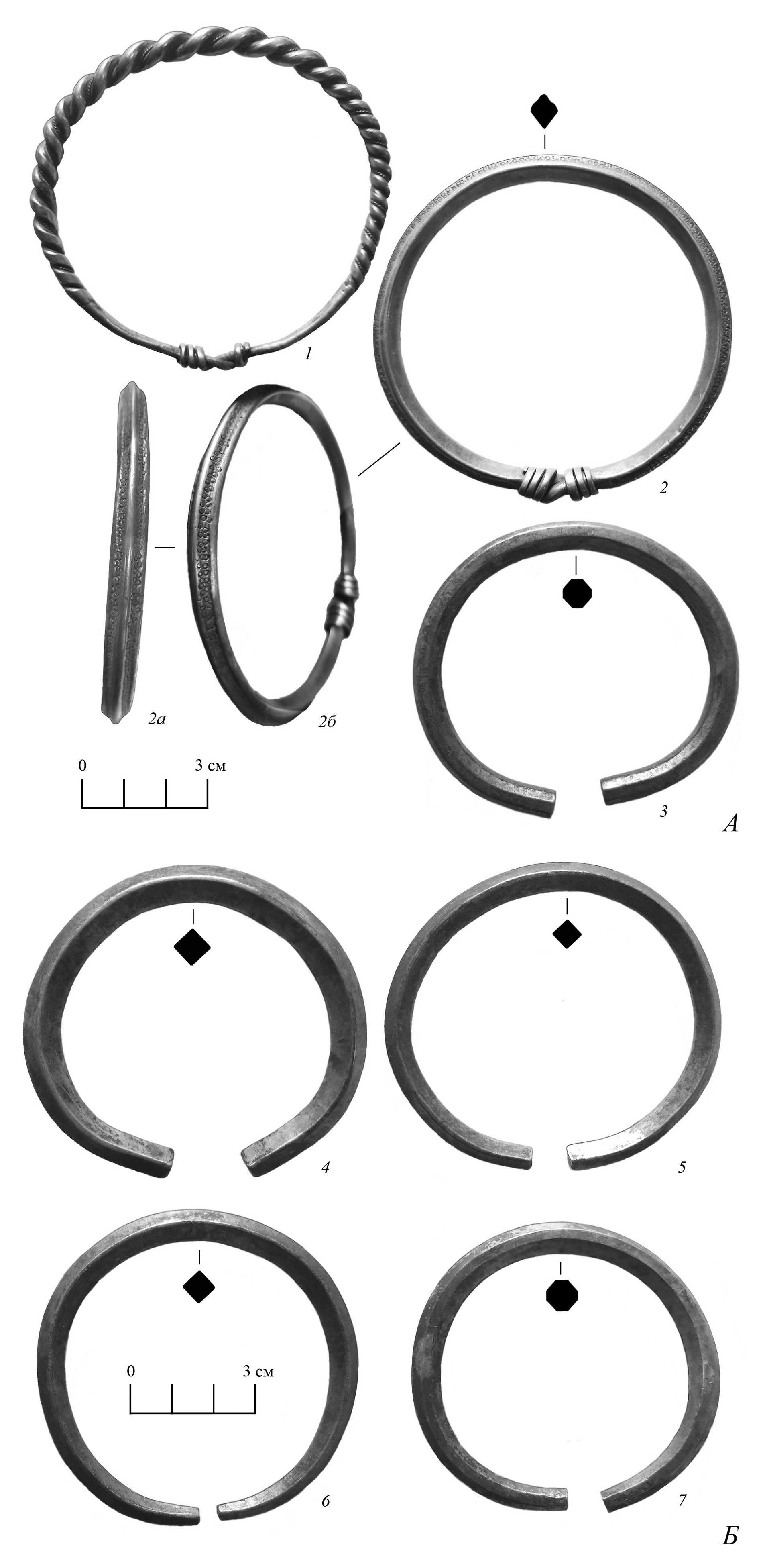 Рис. 1. Коробкино. Браслеты (А, Б). 1, 3, 4–7 – серебро; 2 – серебро с позолотой. Фото автора.