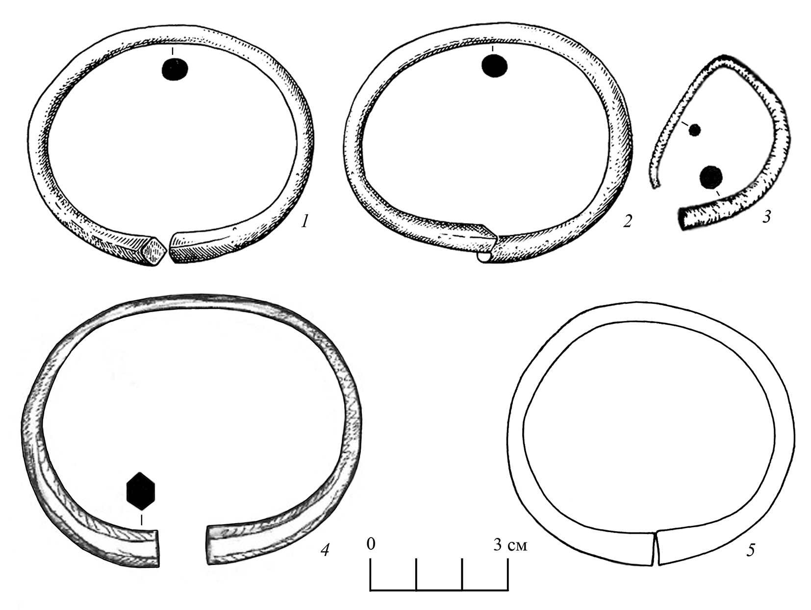4. Fig. 3. Thick wire bracelets with cut off flared ends. 1, 2 – after Kuza, 1981; 3 – after Grigoryev, 2000; 4 – after Grebennikova, Shpilev, 2009; 5 – after Enukov, 2008