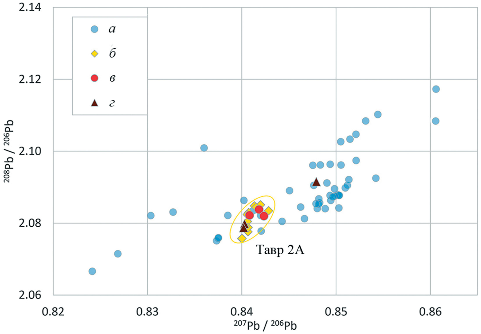 Масс-спектрометрические измерения изотопных отношений свинца выполнены на многоколлекторном масс-спектрометре NEPTUNE (Чернышев и др., 2007). Анализ проводился в режиме “wet plasma” для растворов образцов, трассированных таллием (Tl). Корректирование эффекта приборной масс-дискриминации осуществлялось по результатам измерения опорного отношения 205Tl/203Tl, которое принималось равным 2.3889±1. Погрешность измерения оценивалась по долговременной воспроизводимости результатов анализа стандартного образца Pb SRM 981 (n=11) и образца горной породы AGV-2 (n=4). Величина аналитической погрешности для отношений 206Pb/204Pb, 207Pb/204Pb и 208Pb/204Pb не превышала ±0.03% (2SD).