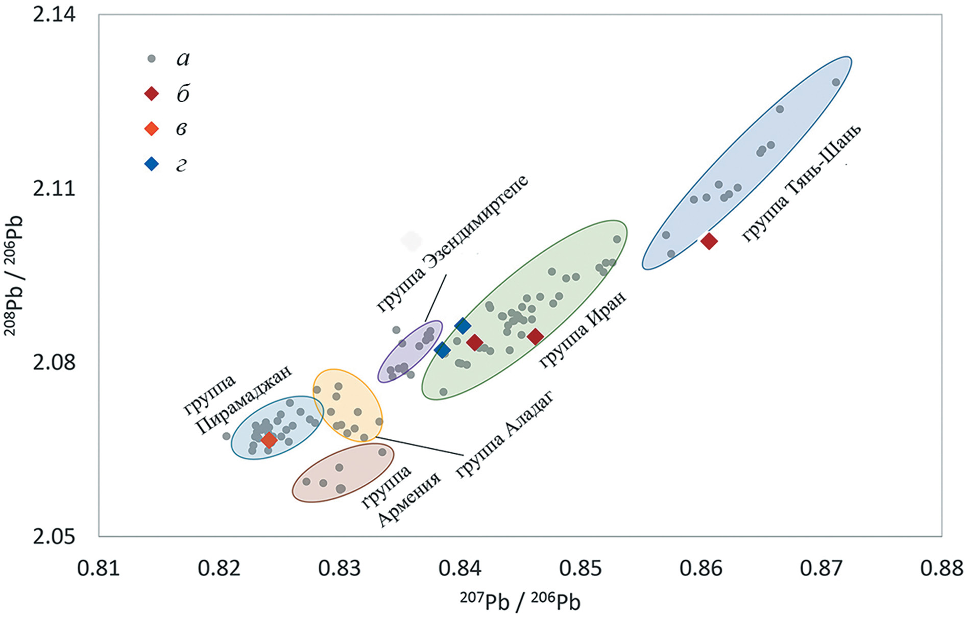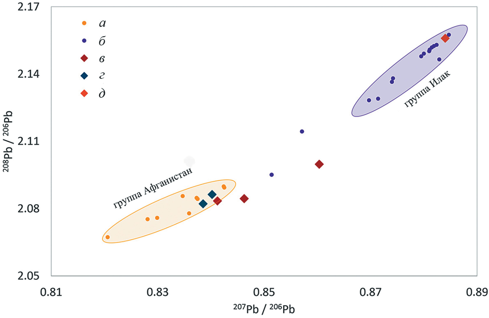 2. Рудные месторождения обладают определенными географическими и хронологическими особенностями по их разработке, поэтому, сравнивая их Pb-Pb изотопные характеристики с характеристиками готовых изделий, можно выявить корреляционные зависимости в изотопном составе свинца, которые дают возможность отследить движение металла во времени и пространстве (Merkel, 2016).