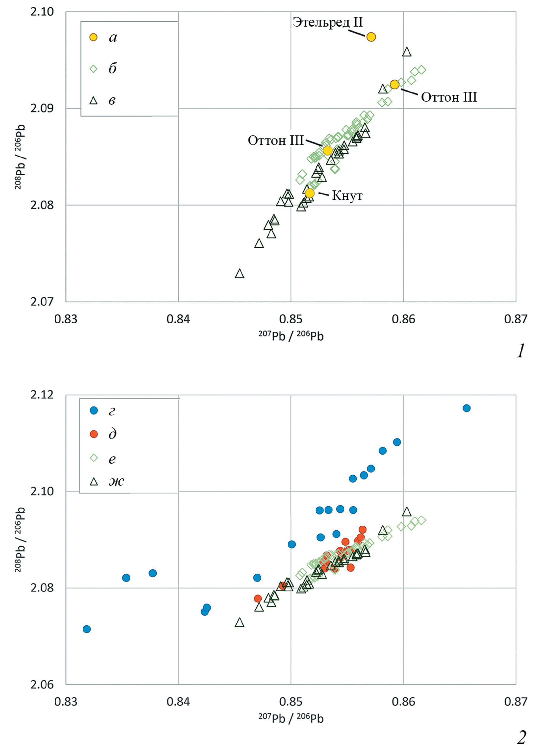 Например, Pb-Pb данные западно-/центральноевропейских серебряных монет рубежа X–XI вв., доминирующих в североевропейской морской торговле XI в., очень узкие. Они хорошо согласуются с рудными источниками Германии и/или Англии (Merkel, 2016). Такой узкий диапазон Pb-Pb данных позволяет достаточно уверенно идентифицировать западноевропейские источники серебра в исследуемом массиве.