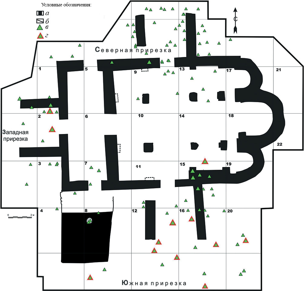 Рис. 1. План храма у с. Веселое в границах раскопа 2010–2011 гг. с расположением находок оконного стекла. Условные обозначения: а – стены храма (с реконструкцией), б – граница раскопа, в – осколки оконного стекла, г – осколки оконного стекла в засыпке ям погребений.