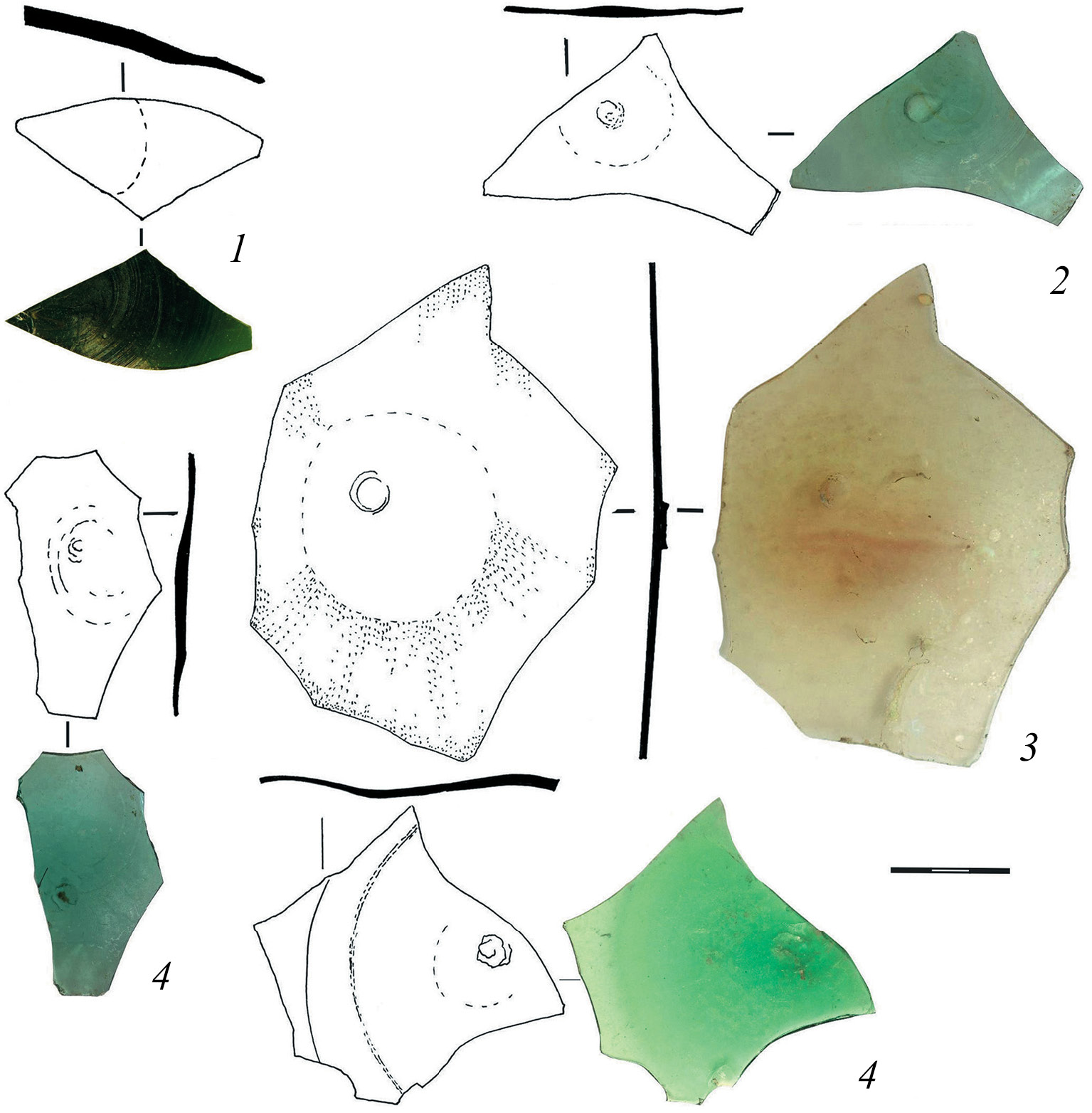 Рис. 2. Центральные части гладких оконных дисков (1, 2, 4) и фрагментированный гладкий пурпурный диск (3). 2, 3 – цветное стекло.