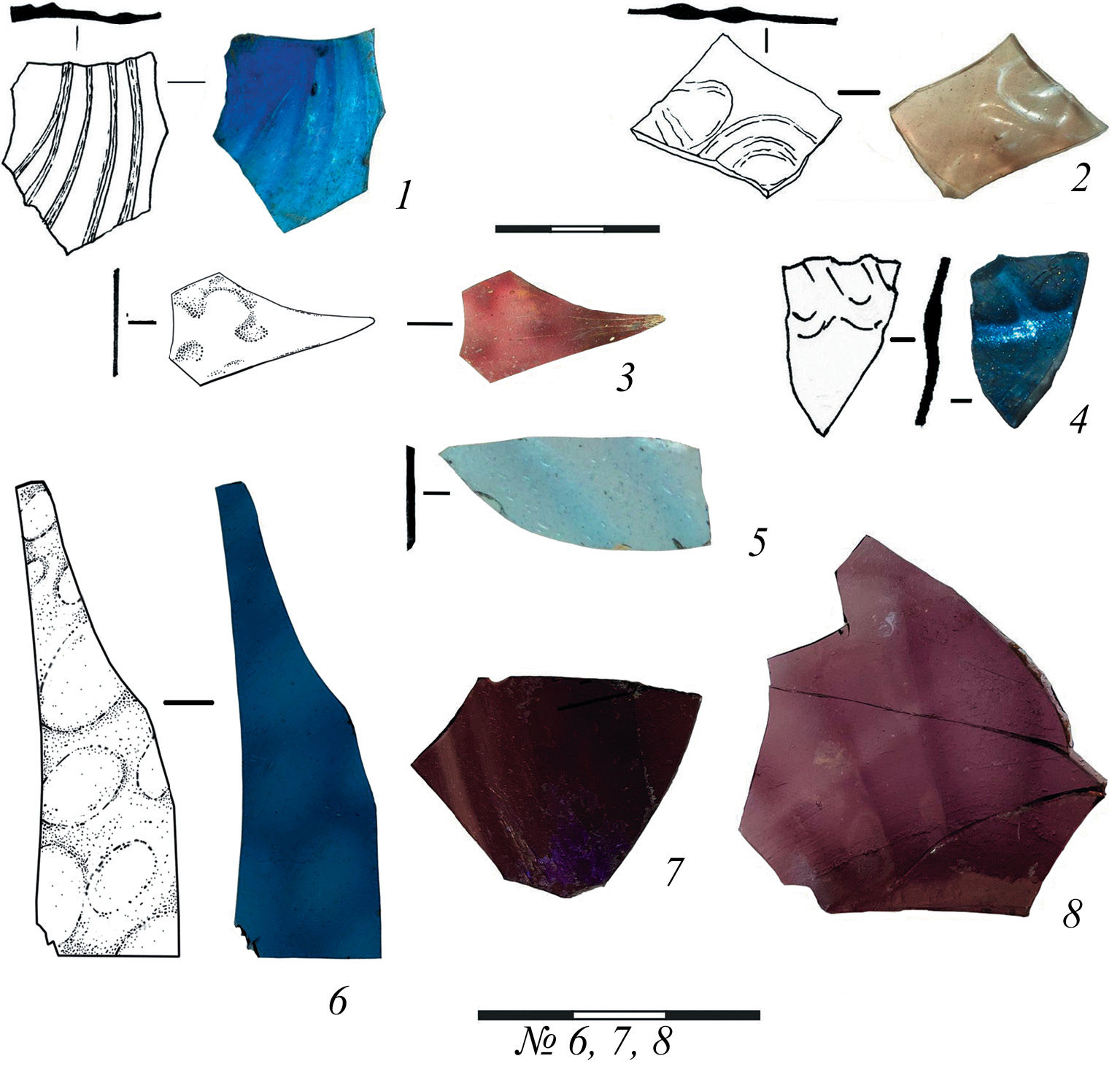 Fig. 7. Fragments of window discs with relief decoration. 1, 3, 4, 6–8 – Coloured glass