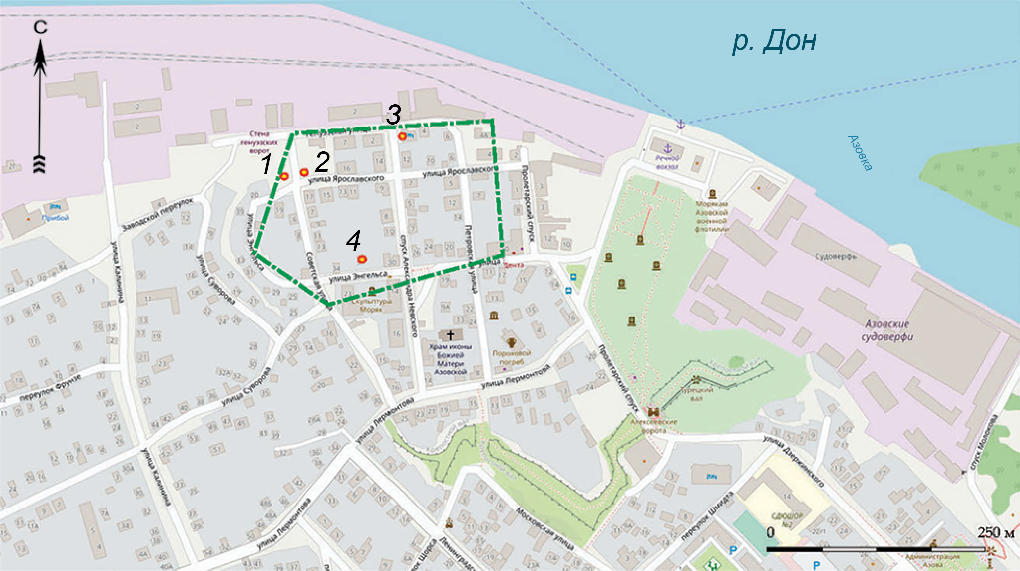 Fig. 2. Map of the port area of Azov indicating the conventional boundaries of the Ottoman Azak fortress and archaeological sites with finds of Anatolian ceramics of the TWBB group: 1, 2 – excavation sites I and II in Yaroslavskogo street in 1962; 3 – excavation site at 3, Genuezskaya street in 2004; 4 – test pit 5 in 32, Engelsa street in 2020