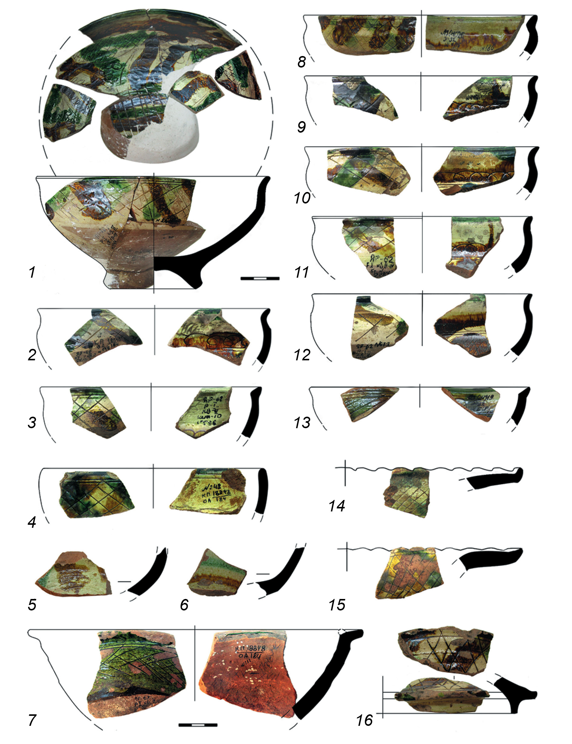 Ассортимент продукции описываемого гончарного центра (или центров) не очень разнообразен и представлен на памятнике в основном столовой посудой, относящейся к разряду бытовой емкостной керамики. Встречаются фрагменты (целых форм нет) толстостенных (толщина стенок – 0.8-1.3 см) и тонкостенных (толщина стенок – 0.5-0.7 см) глазурованных сосудов (всего – 21 фрагмент) исключительно открытой формы – тарелок (2 фрагмента) и чаш (14 фрагментов) разных типов (4 фрагмента – неопределенной формы). Некоторые чаши имели крышки (1 фрагмент) (таблица; рис. 3). Все изделия, за исключением одной чаши, были украшены подглазурным декором в виде поангобной росписи зеленым и коричневым, часто в сочетании с орнаментом сграффито, нанесенным на внутреннюю (чаши и тарелки) и верхнюю часть внешней поверхности (бортики чаш) сосудов, а также на внешнюю поверхность корпуса крышки. Глазурь – прозрачная, желтоватого или зеленовато-коричневого цвета, довольно хорошего качества (без пузырьков воздуха и крупных частиц не растворившегося красителя).