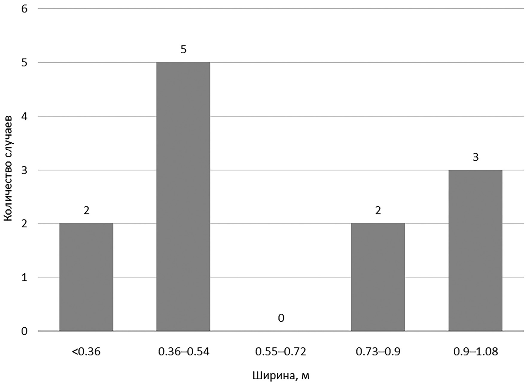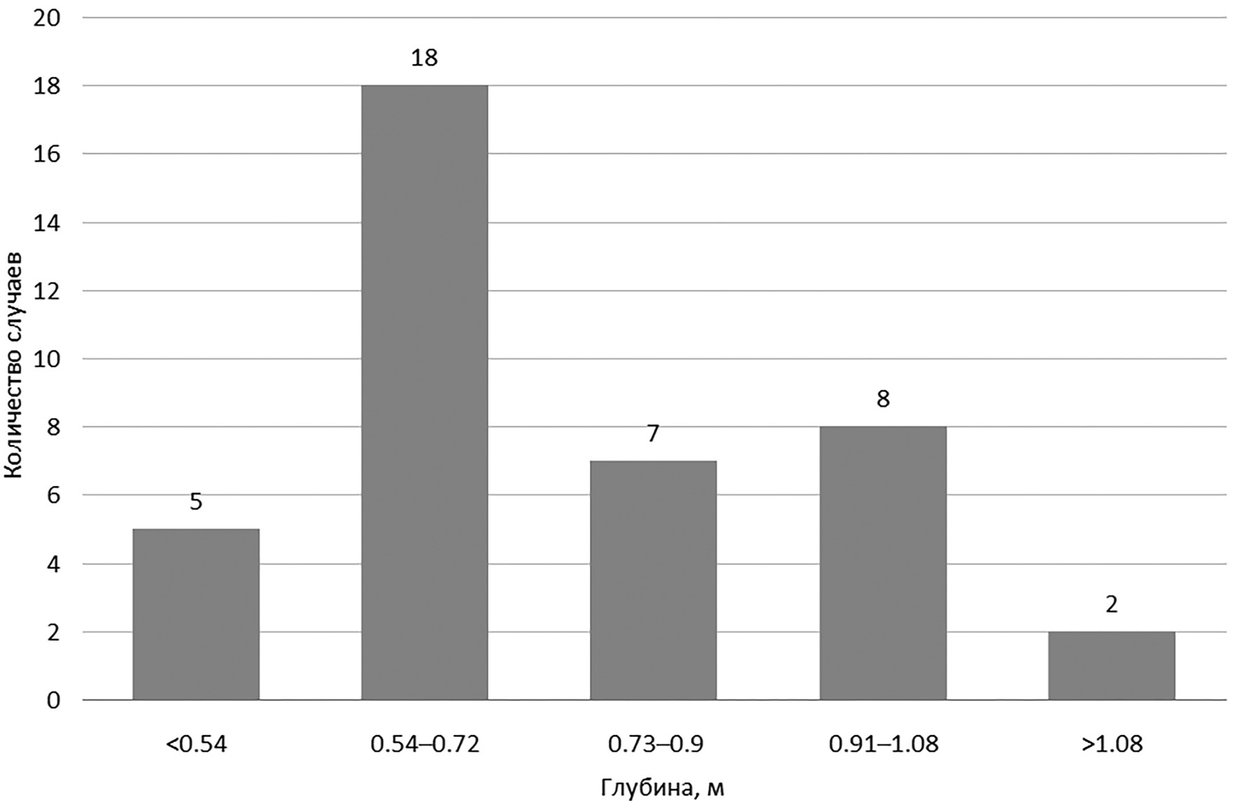Анализ глубины канавок показал, что она находится в диапазоне от 0.4 до 1.3 м. Наиболее распространенная глубина – 0.54–0.72 м (45%), на интервал от 0.54 до 1.08 м приходится 83% случаев (рис. 1).