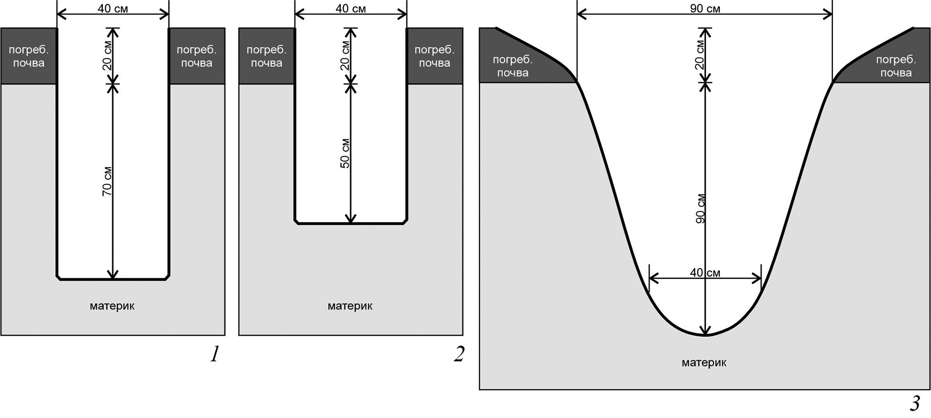 Вид канавки в разрезе определяется ее глубиной и шириной (рис. 3). Если канавка шириной около 0.4 и глубиной до 0.7–0.8 м от дневной поверхности или в материковом грунте при небольшой мощности погребенной почвы, то она, как правило, имеет вертикальные стенки и плоское дно. Если глубина превышает указанное значение, то канавка приобретает расширение в верхней части. В таком случае в разрезе она имеет вид параболы2, как это зафиксировано, например, в Казымском остроге, где глубина канавки от дневной поверхности на одном из участков составляла 1.1 м (Молодин и др., 2018. С. 24. Рис. 15). Если ширина канавки существенно больше 0.4 м, то она имеет вертикальные стенки и при глубине, существенно более 0.7 м, так как увеличенная ширина позволяет изымать грунт с большей глубины.