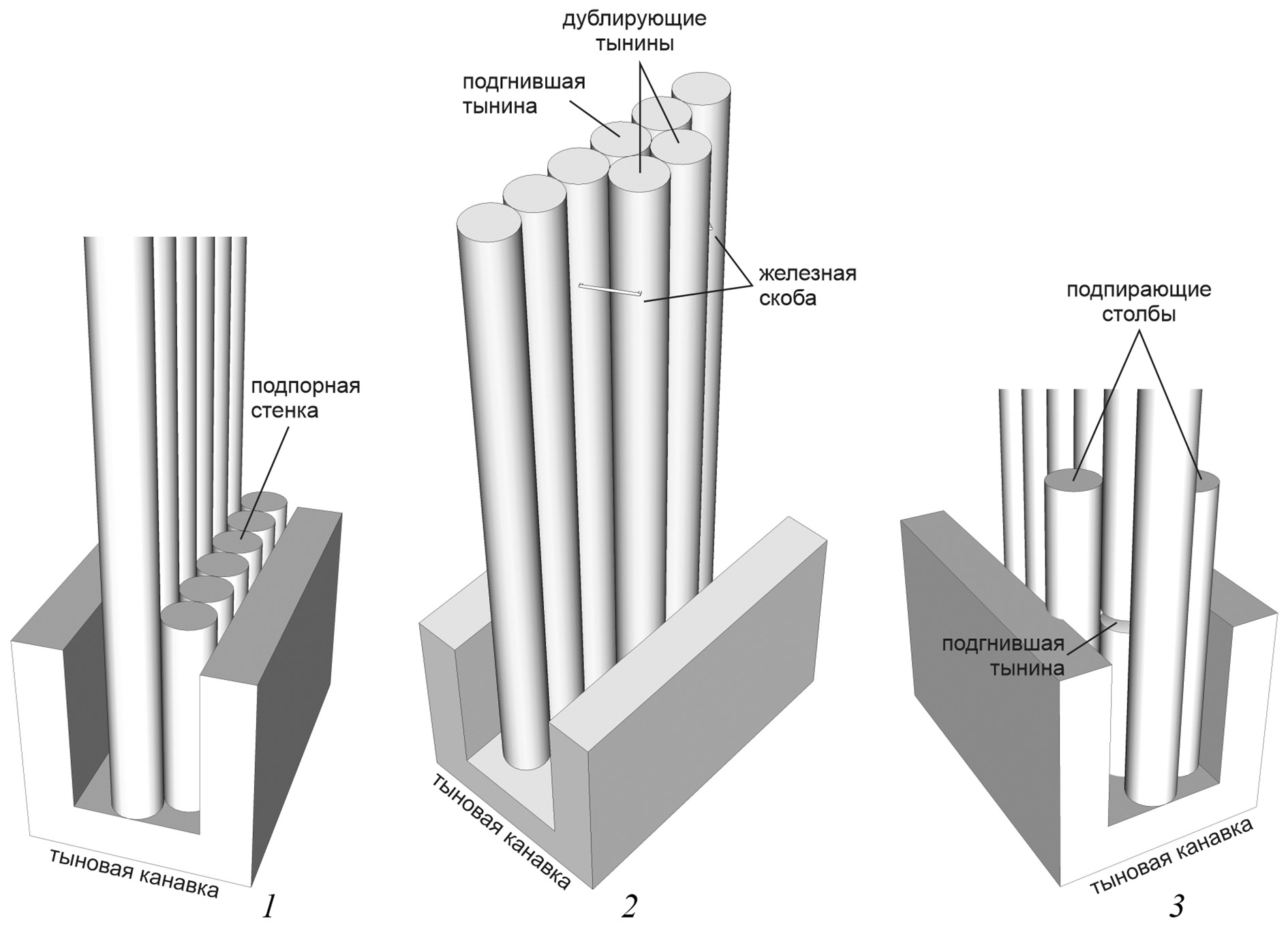 Если одна из тынин в стене полностью перегнивала у своего основания и одновременно ее крепление в ласточкин хвост становилось ненадежным, то создавался риск того, что при штурме противник сделает в этом месте пролом. Такую тынину нужно было заменить или укрепить. При скреплении бревен в стену с помощью самого распространенного приема “на иглах” (в ласточкин хвост) (Горохов, 2024б) замена отдельных тынин была невозможна. В этих условиях целесообразно было продублировать ветхую тынину одной или двумя новыми. При археологических исследованиях такой ремонт будет представлен остатками одного или двух столбов, стоящих вплотную к остаткам тыновой стены. В практике археологических исследований подобные случаи не редки, но они не часто находят отражение в публикациях (см., например: Матвеев и др., 2012. С. 181). Дополнительные тынины не могут быть скреплены с основной стеной в ласточкин хвост. Вероятно, они крепились к стене с помощью железных скоб (рис. 4, 2). Если тынина подгнила у основания, но крепление в ласточкин хвост остается надежным, то в таком случае достаточно укрепить проблемную тынину у ее основания с помощью двух невысоких столбов, которые при раскопках будут представлены остатками вертикальных бревен, стоящих вплотную к остаткам тынин с двух сторон от подгнившей тынины (рис. 4, 3).