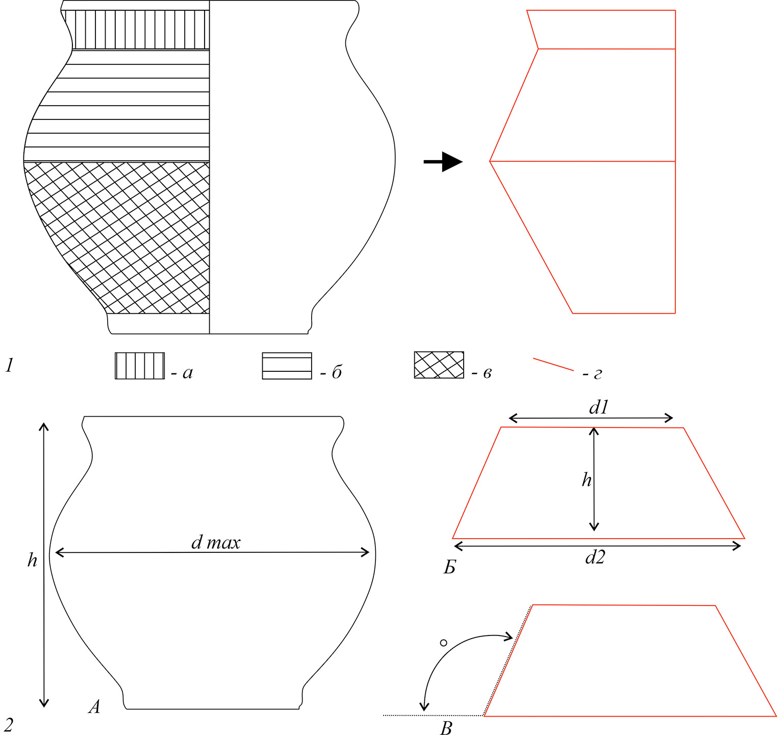 2. Fig. 1. Research methodology: 1 – the functional parts subject to analysis (а – cheek-neck, б – shoulder-brachium, в – body, г – frame of vessel shape); 2 – the parameters of vessel shapes under study: A – general proportion of vessel shape, Б – proportion of functional parts, В – inclination angle of functional parts frame