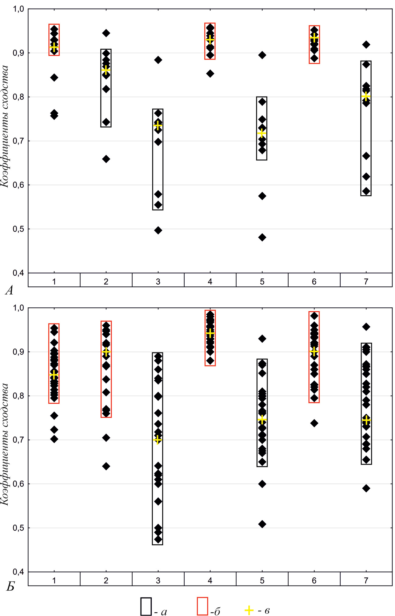 Все остальные параметры форм – угол наклона Щ-Ш, а также пропорциональность Щ-Ш, П-ПП и Т – показали более низкие значения КС (рис. 2, А: параметры 2, 3, 5, 7). У угла наклона Щ-Ш в большинстве серий этот показатель составляет от 0.82 до 0.89, а у пропорциональности функциональных частей – от 0.50 до примерно 0.88.
