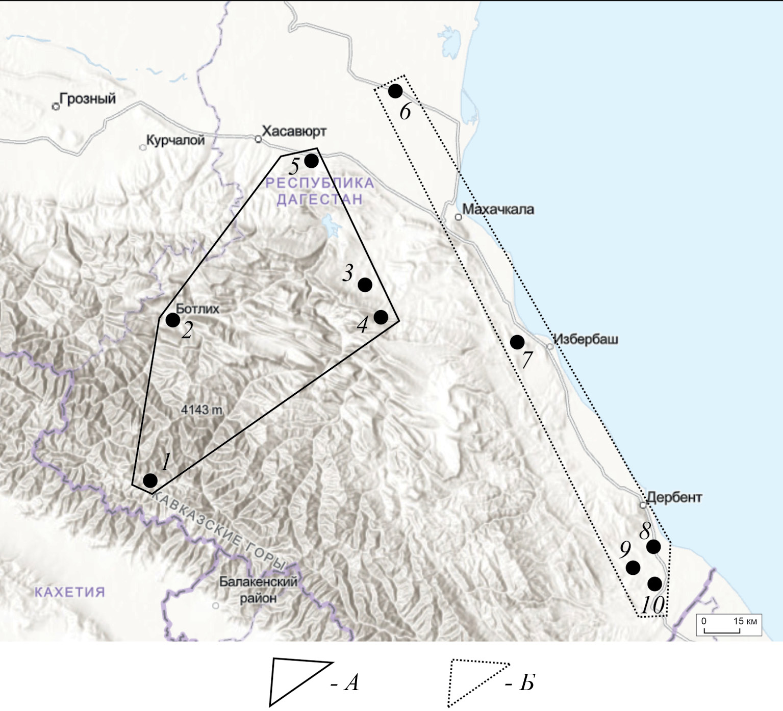 4. Fig. 3. The Albanian-Sarmatian and early medieval sites on the territory of Dagestan: 1 – Bezhta; 2 – Botlikh; 3 – Agachkala; 4 – Arkas; 5 – Verkhny Chiryurt; 6 – Lvovskie; 7 – Urtseki; 8 – Palasa-syrt; 9 – Sirtich; 10 – Sharakunsky. А – first group; Б – second group