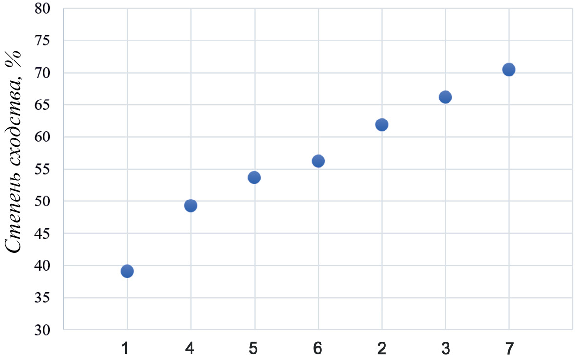 Рис. 4. Степень сходства форм кувшинов из памятников первой и второй групп (номера параметров на оси абсцисс – как на рис. 2).