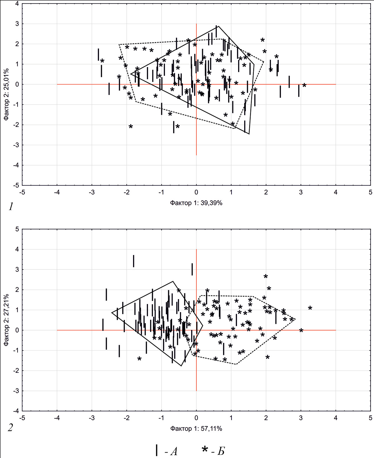 Fig. 5. Results of comparing jugs shapes of the first and second groups using the principal component method: 1 – analysis based on unstable parameters; 2 – analysis based on the body inclination angle, the inclination angle of shoulder-brachium, and the general proportion of the vessel shape. аvessels from sites of the first group; бvessels from sites of the second group