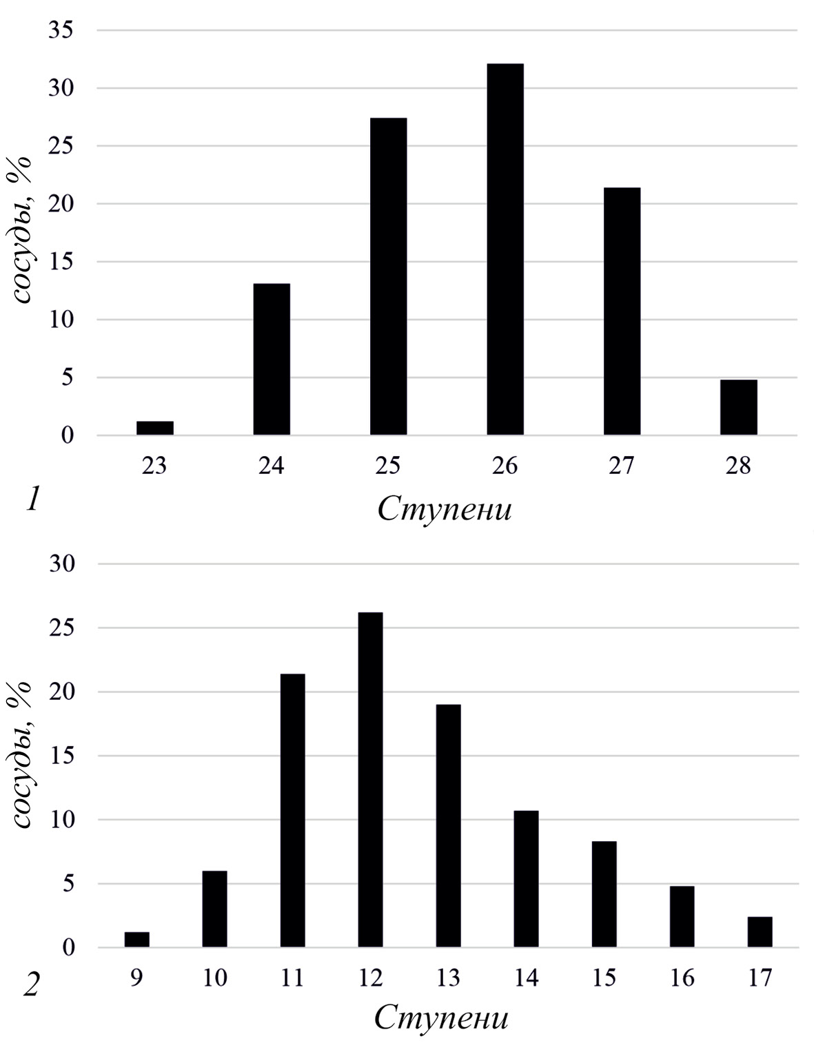 Строго фронтальные фотографии сосудов, изготовленных в ходе экспериментов, переводились в плоские контурные изображения и приводились к одной высоте. После этого сосуды разделялись на функциональные части по принятой методике (Цетлин, 2018. С. 130–137). Затем выполнялись измерения угла наклона и пропорциональности функциональных частей, а также ОПП всего сосуда.