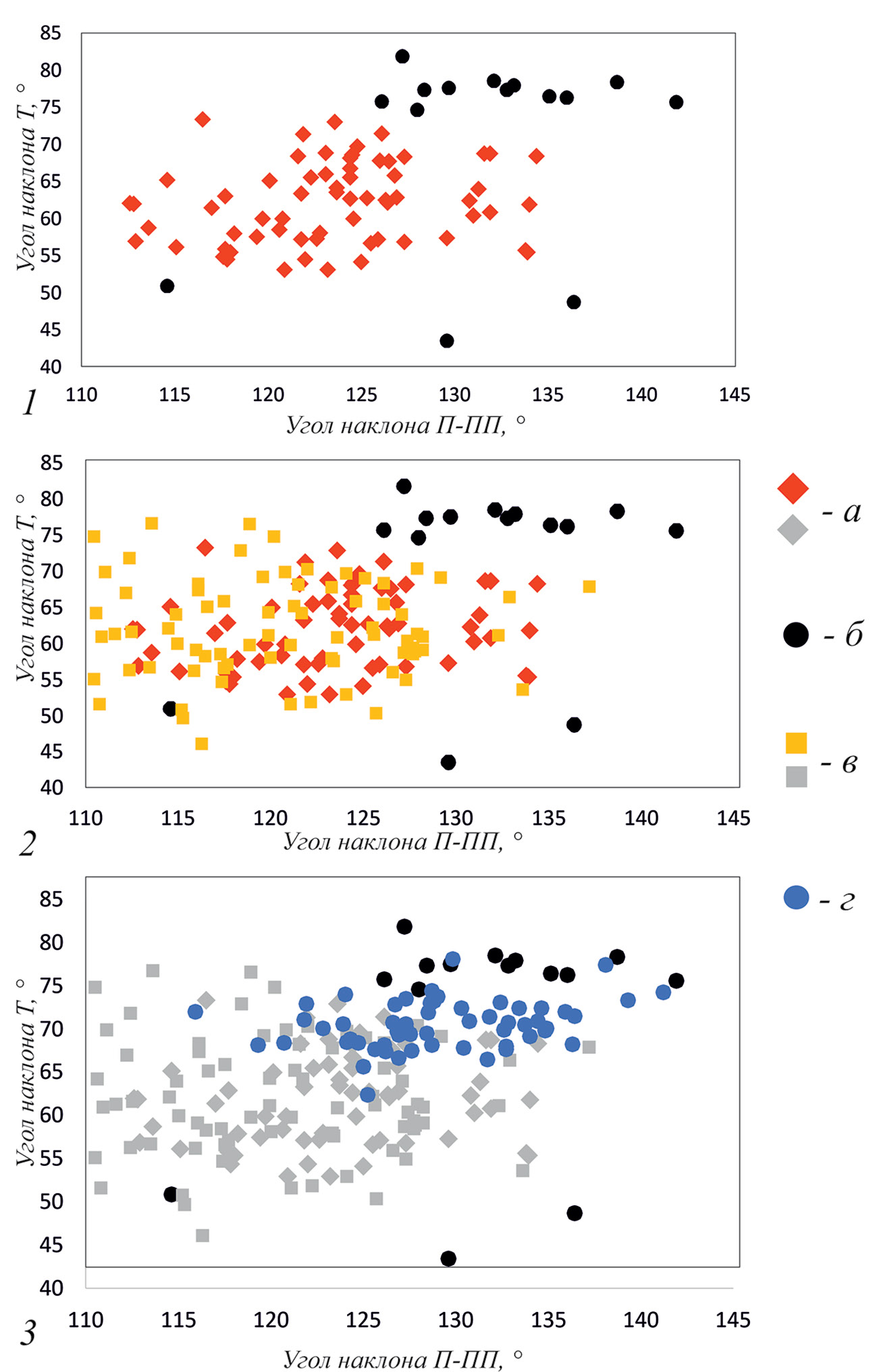 Этап 2 заключается в изучении соотношения доминантных и рецессивных традиций создания форм кувшинов. Для решения этой задачи можно использовать диаграмму рассеяния (рис. 7, 1), в которой по одной оси даны значения угла наклона П-ПП, по другой – угла наклона Т.