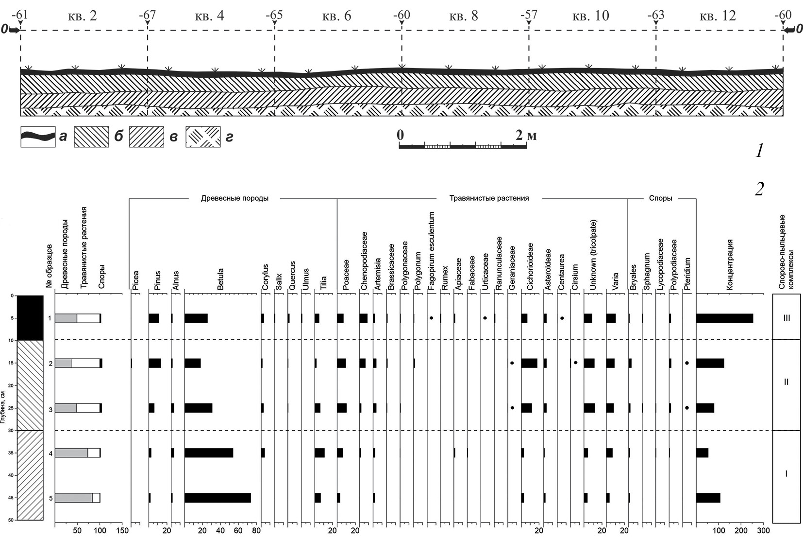 Fig. 2. The Chekalino II site. Stratigraphic cross-section along the north-south line (squares 2, 4, 6, 8, 10, 12), west view (1), spore-pollen diagram along the cross-section (2)