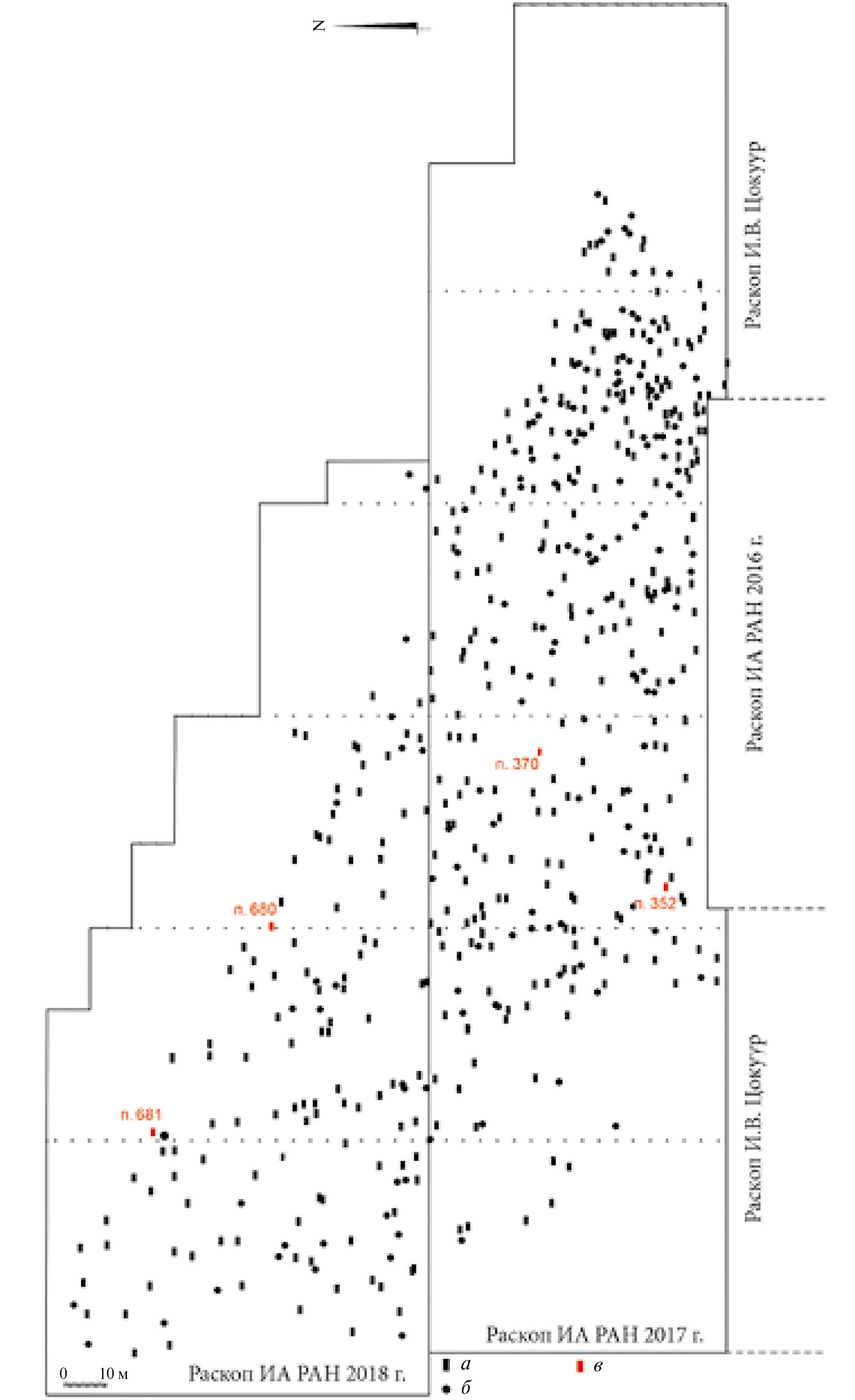 Рис. 2. Общий план некрополя Волна 1 (раскопки 2017–2018 гг.). Условные обозначения: а – погребение; б – погребение с анализом содержимого сосудов; в – комплекс.