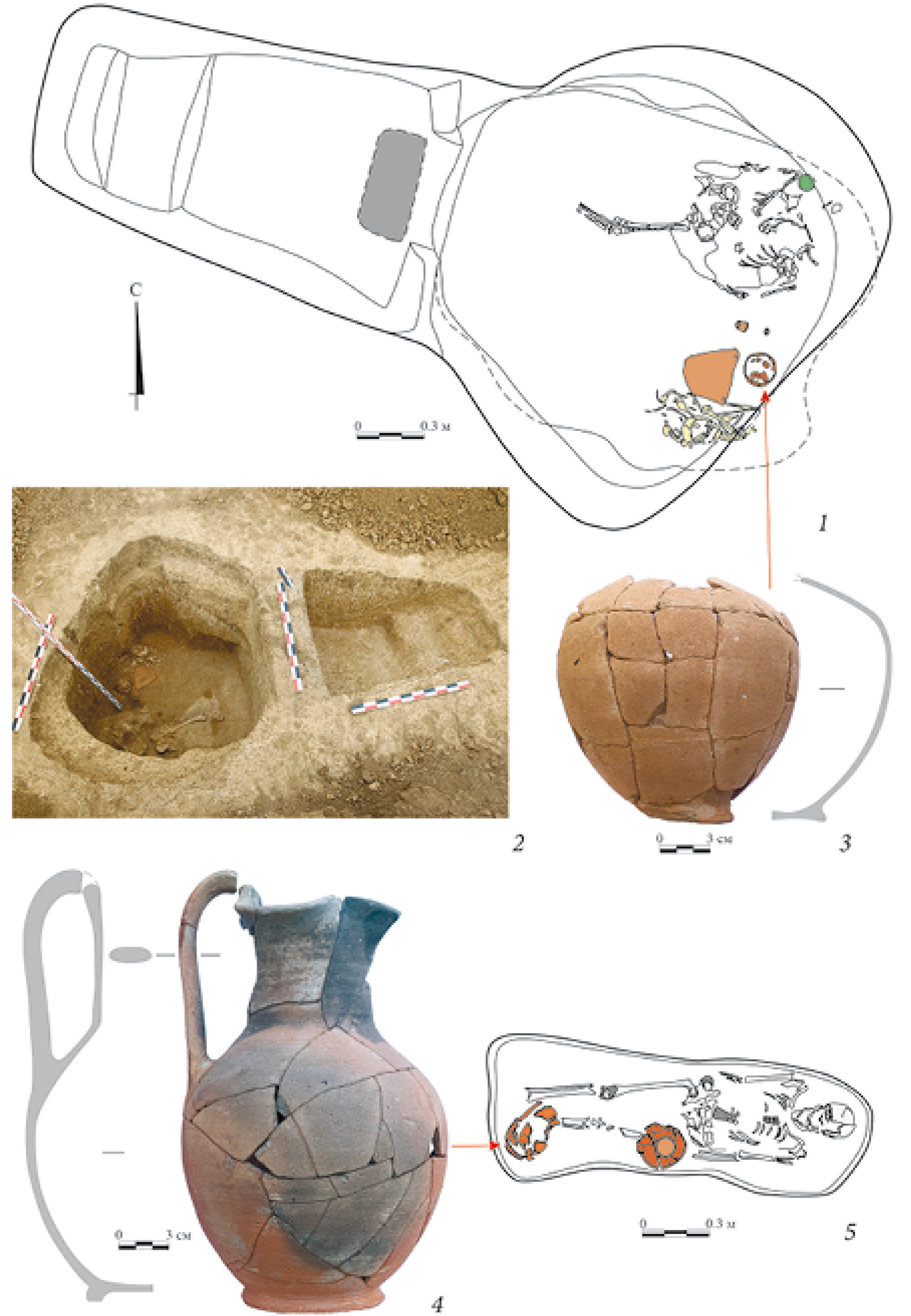 Рис. 4. Некрополь Волна 1. Погребения 680 (1–3) и 681 (4, 5). Планы, фото и находки. 3 – красноглиняный кувшин; 4 – ойнохойя.