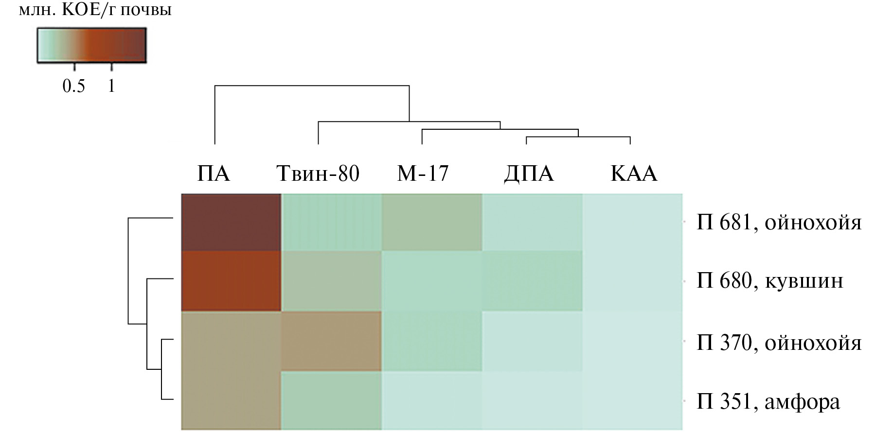 Fig. 5. Clustered heat map of the growth intensity of soil microbial communities from the bottom of burial vessels on solid nutrient media, where: PA – soil agar; TWIN-80 – a medium for the growth of lipolytics involved in the decomposition of fats; M-17 – lactose-containing medium; DPA – peptone agar; KAA – starch-ammonia agar