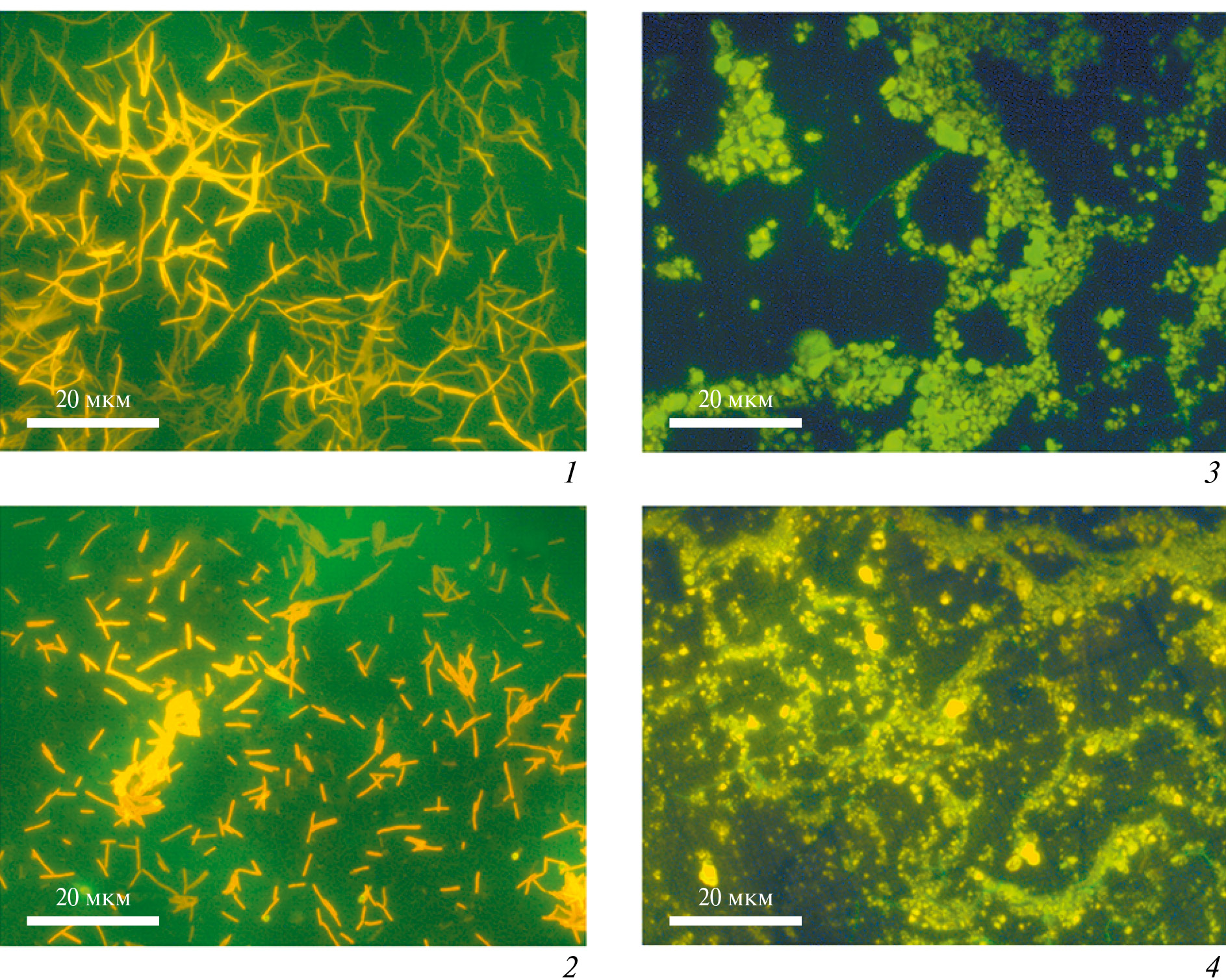 Рис. 6. Культуры молочнокислых бактерий, окрашенные акридином оранжевым (1, 2) и отсутствие роста культуры после инкубации в бульоне MRS. 1 – погр. 370, ойнохойя; 2 – погр. 680, кувшин; 3 – погр. 681, ойнохойя; 4 – погр. 352, амфора.
