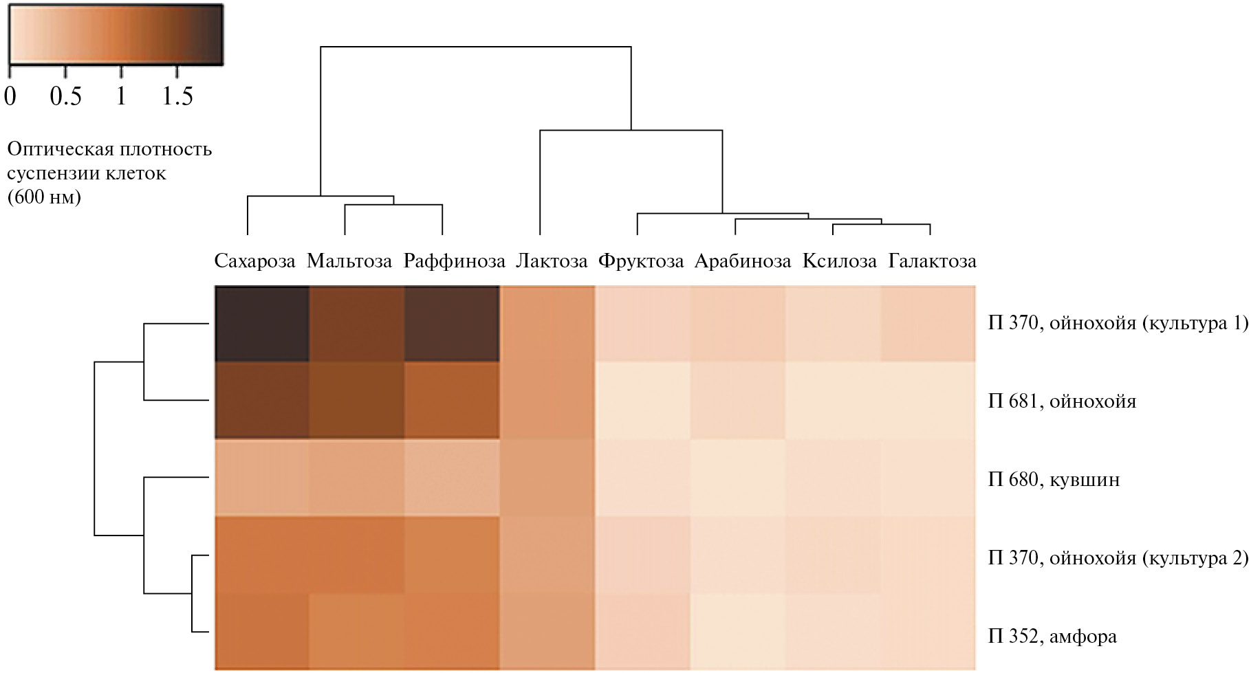 Особенно высокой способностью к сбраживанию сахарозы, мальтозы и раффинозы (рис. 7) отличались одна из культур, выделенная из грунта со дна ойнохойи 370, ее догоняла культура из ойнохойи 681. Вторая культура из ойнохойи 370 по средним показателям сбраживания сахарозы, мальтозы и раффинозы группировалась с культурой из амфоры 352. Интенсивность сбраживания лактозы для всех культур была сходной, на уровне наиболее низких показателей по группе упомянутых сахаров. Остальные сахара практически не поддерживали рост исследуемых культур.