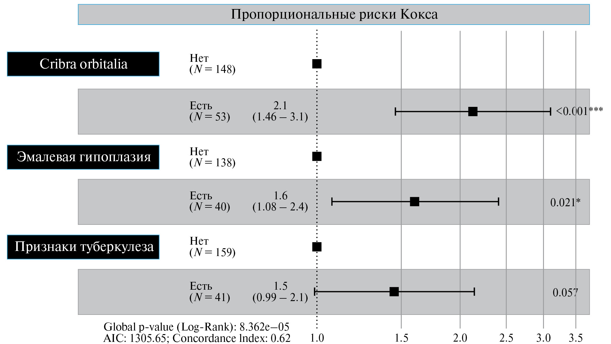Рис. 2. Модель пропорциональных рисков Кокса при наличии нескольких индикаторов. Звездочками отмечен результат теста Вальда (статистически достоверный вклад переменных cribra orbitalia и эмалевая гипоплазия).