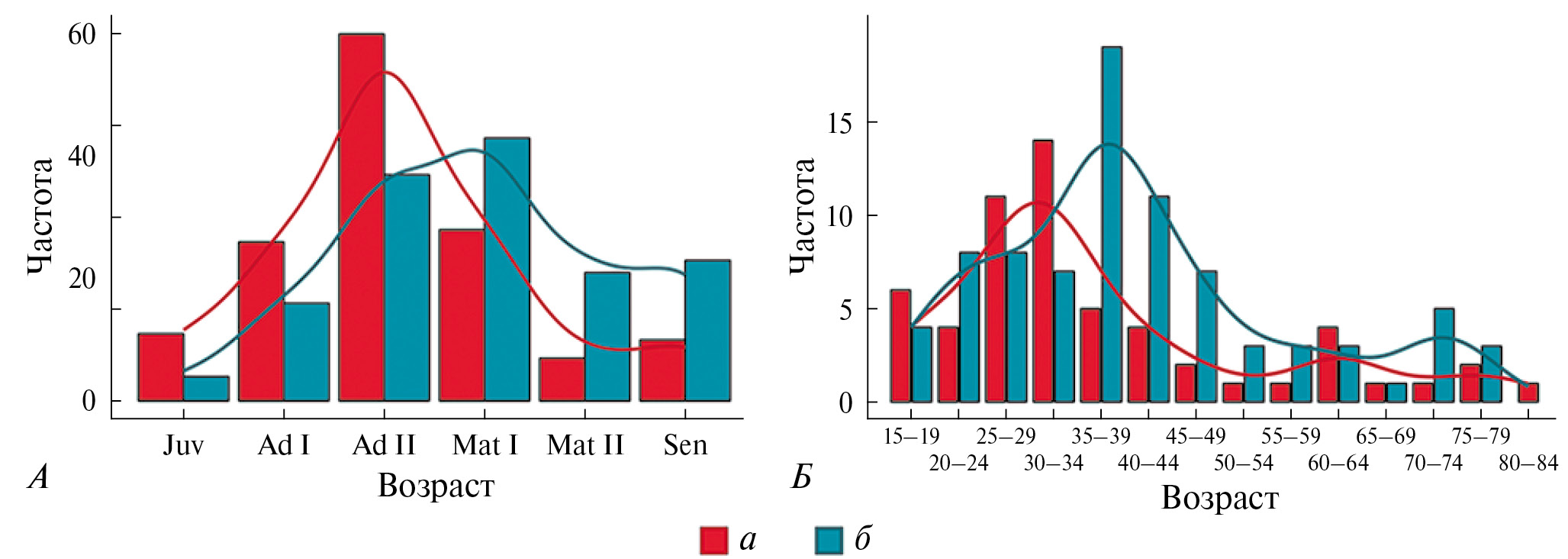 Рис. 3. Возрастное распределение мужчин и женщин выборки Козино, полученное при использовании разных методов оценки возраста смерти: A – возрастное распределение, полученное традиционным методом (с учетом скользящей средней), Б – возрастное распределение, полученное методом перехода (ТА2) и пересчета в 5-и летние интервалы (а – женщины, б – мужчины).