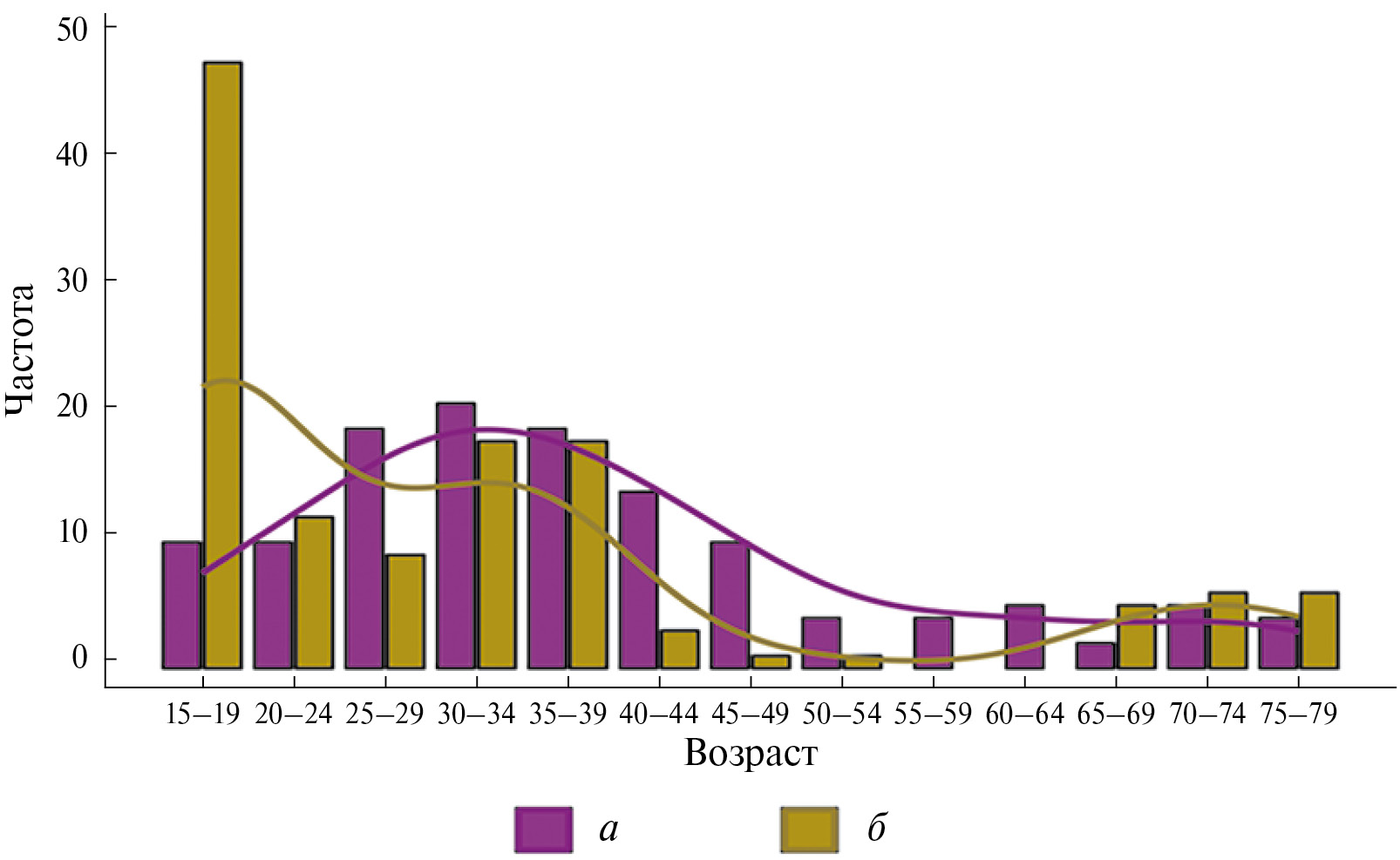 Рис. 4. Тестовое возрастное распределение индивидов с имитацией различной сохранности скелета (метода перехода) (а – полная сохранность скелета, б ‒ только череп).