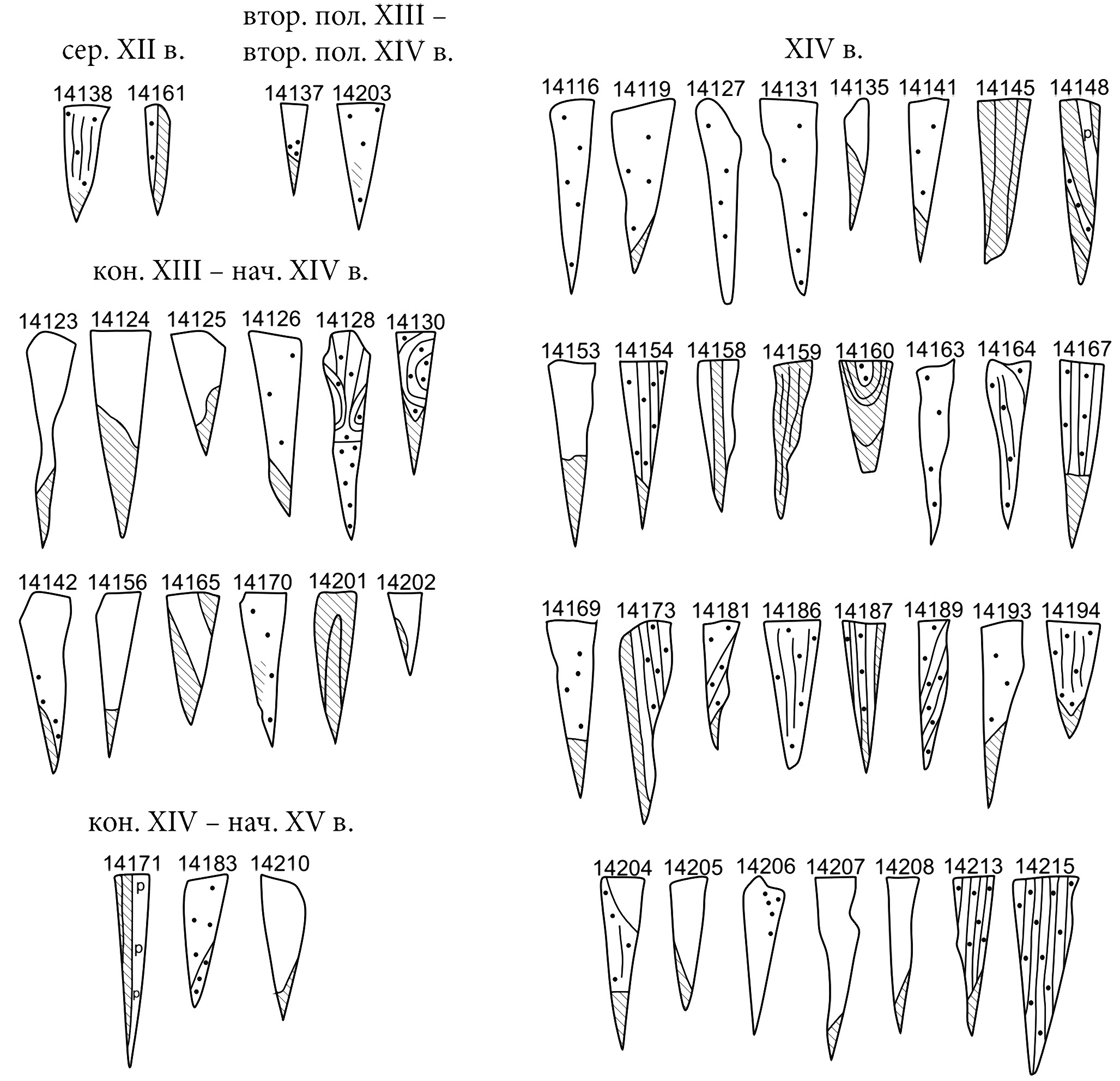 Помимо технологических данных при работе с выборкой селища Катышево получена информация о форме ножей (рис. 2). Только три экземпляра (менее 3%) не имеют уступа со стороны спинки при переходе от клинка к черенку (ан. 14147, 14193, 14198). На этом основании авторы, вслед за отечественными специалистами (Завьялов и др., 2012. С. 17), рассматривают их как ножи “финской” группы. Остальные ножи относятся к группе “древнерусских” (Завьялов и др., 2012. С.17): отличаются от описанных выше уступами при переходе от клинка к относительно короткому черенку. Клинок ножей этой группы широкий, в ряде случаев сильно сточен. Такая форма орудий характерна для материальной культуры населения Северо-Восточной Руси в период развитого и позднего средневековья.