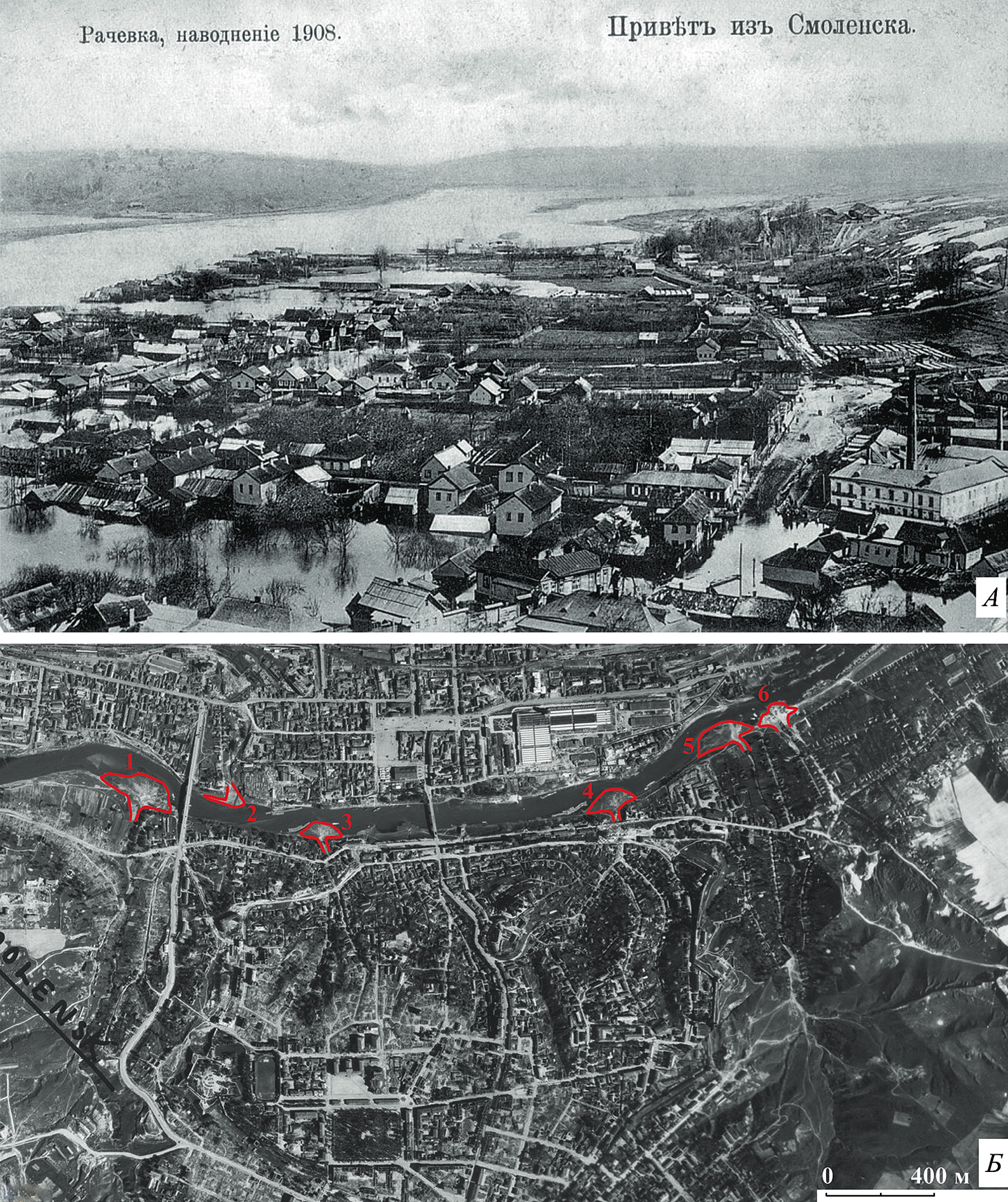 Рис. 1. Паводок и мощные денудационные процессы на фотографиях Смоленска XX в. А – наводнение 1908 г. (уровень подъема воды 11.4 м над нулевой отметкой гидропоста); Б – аэрофотоснимок лета 1941 г., красным цветом обозначены дельты ручьев: 1 – Чуриловка; 2 – Городянка; 3 – Пятницкий; 4 – Георгиевский; 5 – Рачевка; 6 – Мавринский