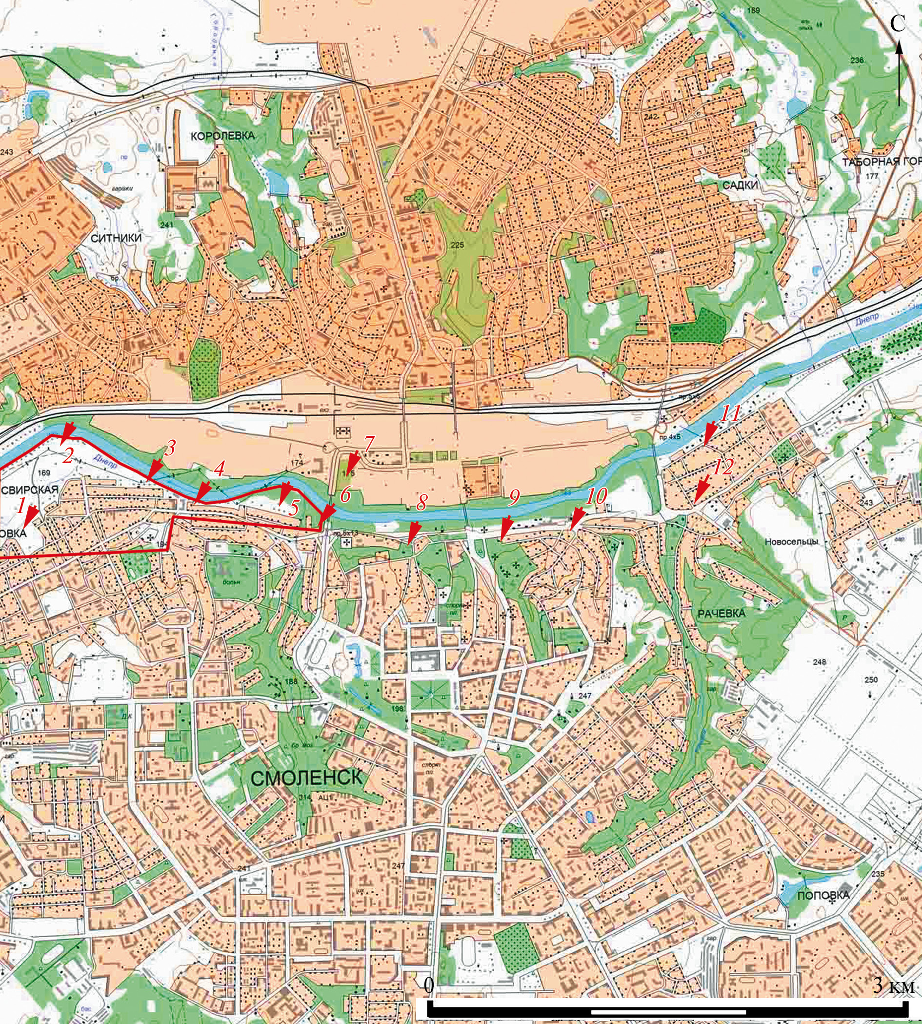 Рис. 2. План Смоленска с указанием мест раскопок в “Нижнем городе”. 1 – Борисоглебский монастырь на Смядыни; 2 – луг в устье р. Смядынь; 3 – Посадский луг; 4 – устье Свирского ручья (Рыливка); 5 – пойма в устье р. Чуриловка; 6 – церковь на Чуриловке; 7 – устье р. Городнянка; 8 – устье Пятницкого ручья; 9 – раскопы на ул. Соболева 1950–1070-х годов; 10 – устье Георгиевского ручья; 11 – ул. Набережная Максима Горького; 12 – ул. Песочная (Мавринский ручей). Красным контуром показан участок врезки, изображенный на рис. 3